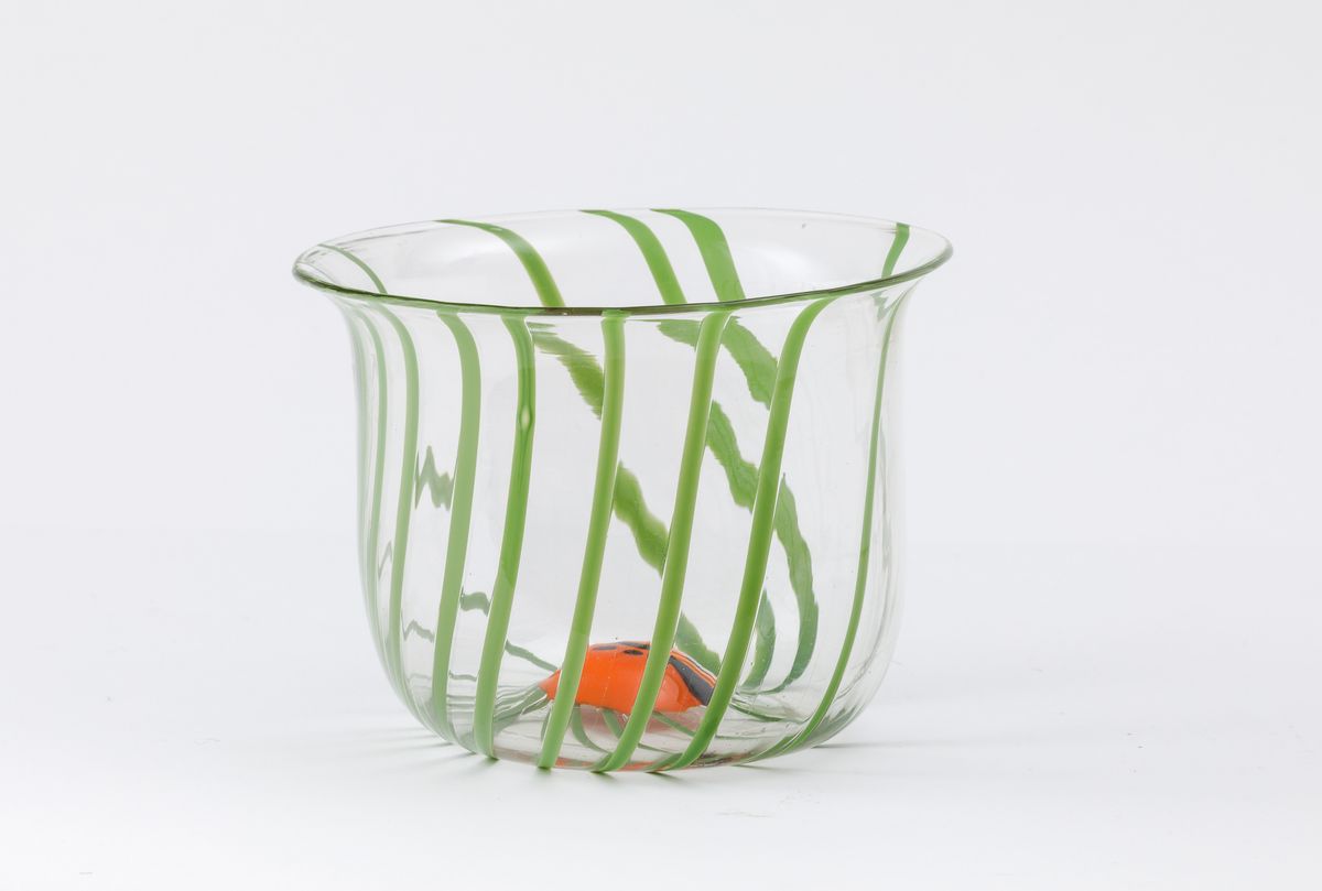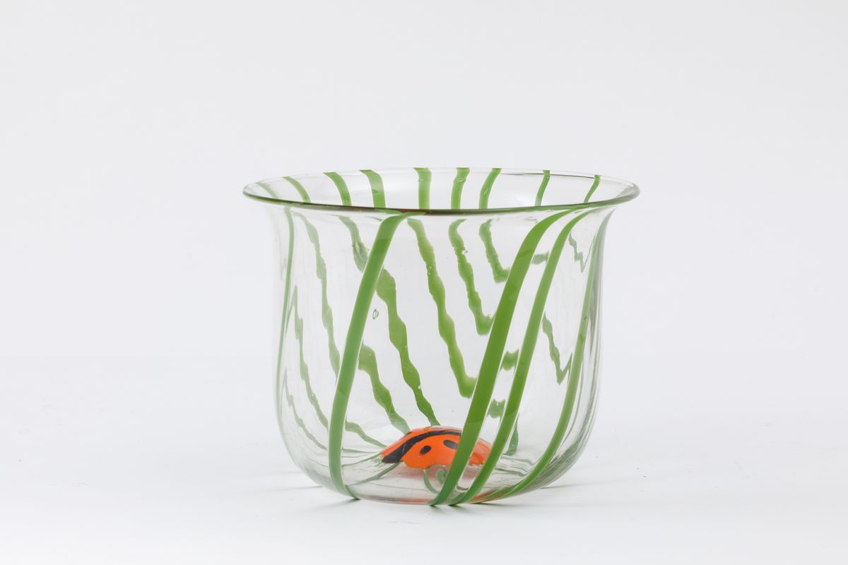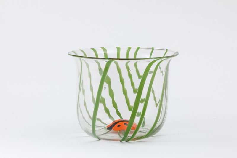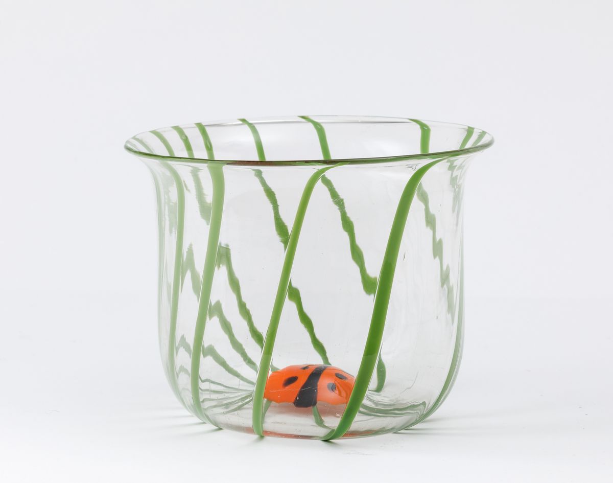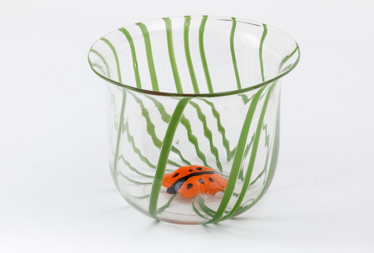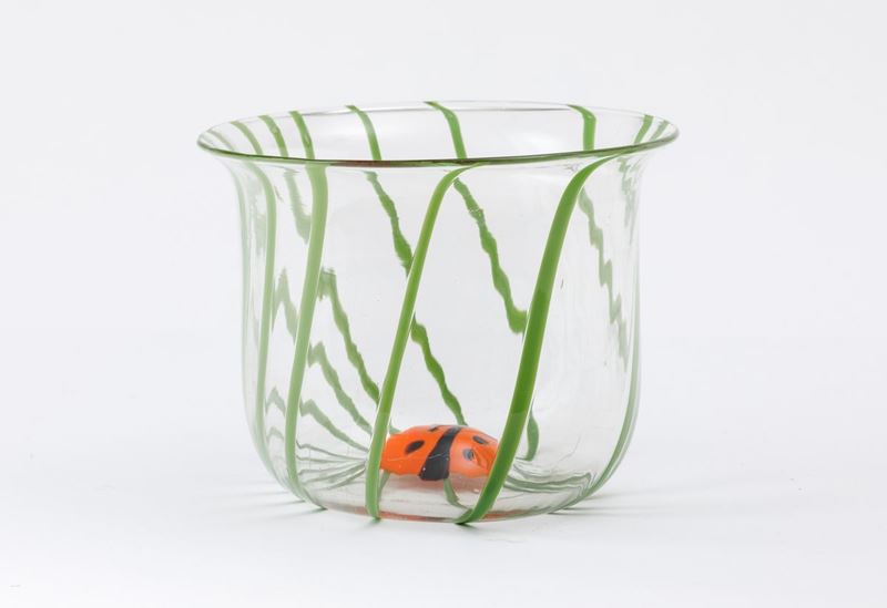 Owe Thorsenn and Brigitta Karlsson. A blown glass bowl with a decor of polychrome canes and a large ladybug murrina on the bottom. H 16cm, diam 21cm. Signed Venini Italia with a four-leaf clover.