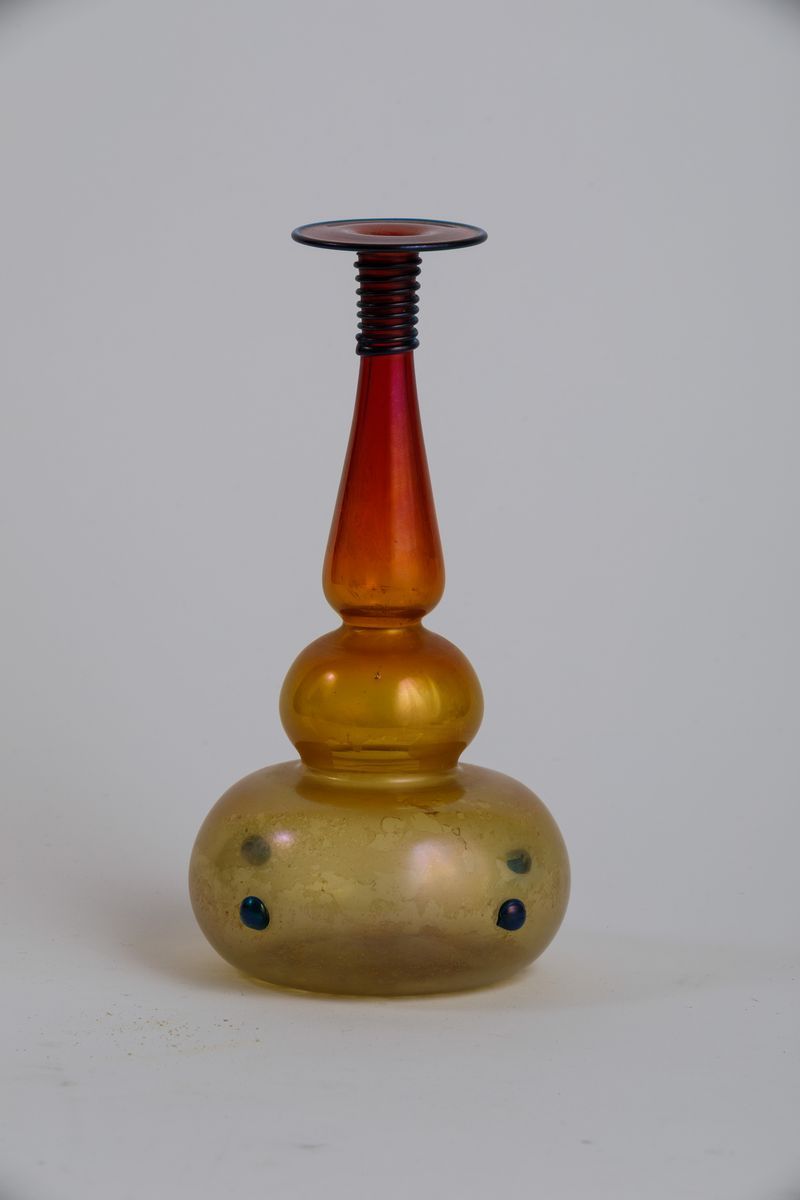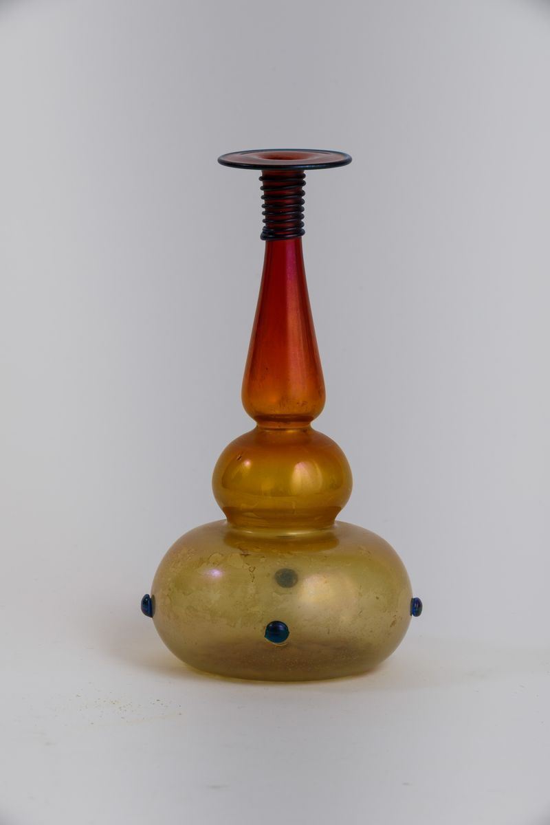 A bottle-shaped blown glass vase with a blurred polychrome decor. Applied details. H 25cm