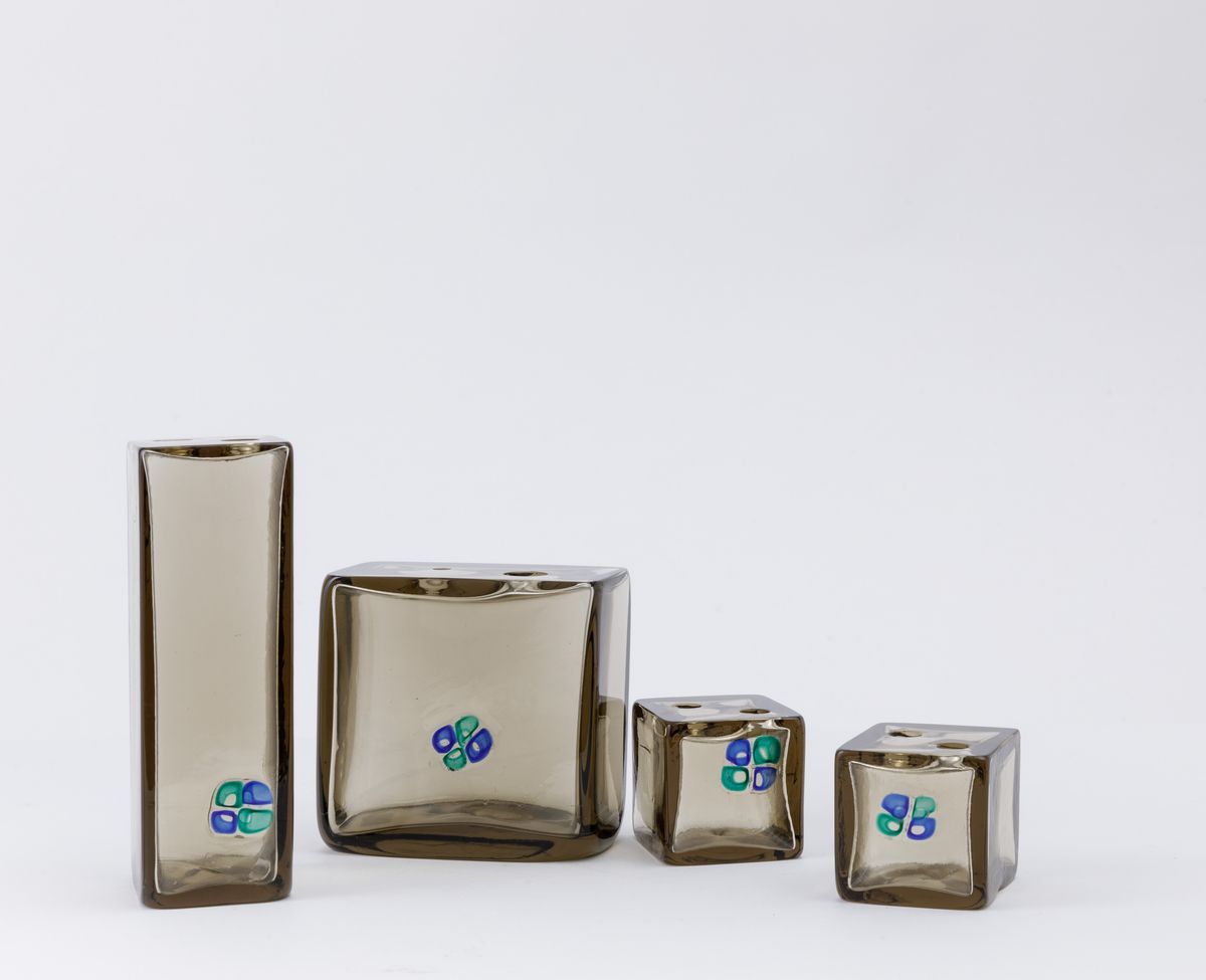 Fulvio Bianconi (1915-1996). A set of four parallelepiped vases in smoked glass with a four-leaf clover decor of murrine. H from 6cm to 17cm