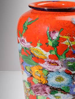 A truncated cone-shaped ceramic vase with coiled handles and a futuristic decor of polychrome enamels. H 8cm, diam 13cm. Manufacture's mark and old label. Slight chipping on the edge.