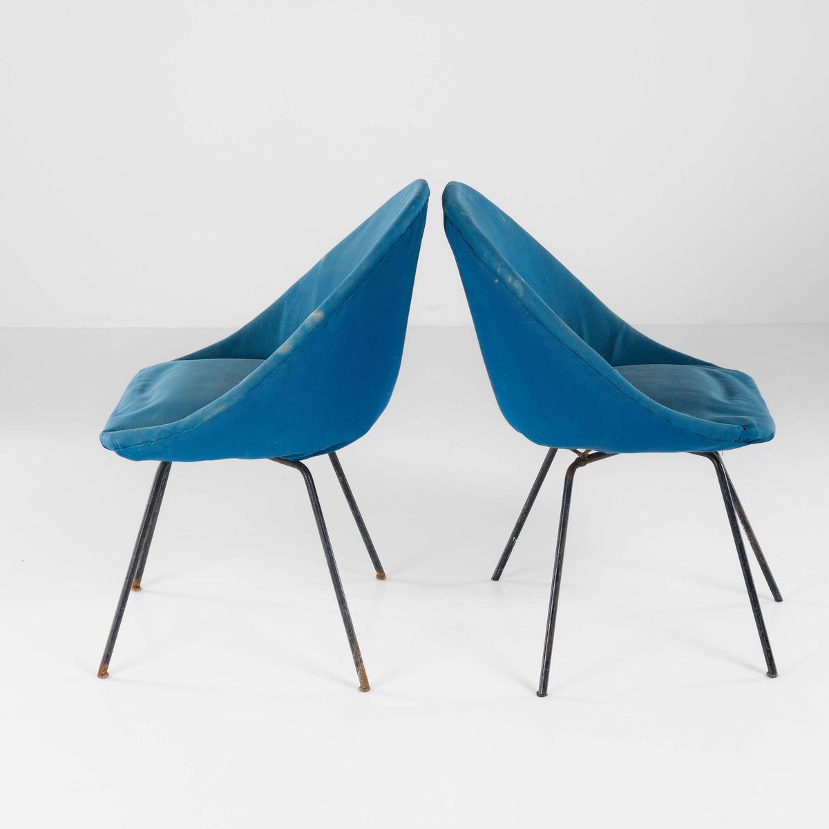 Coppia di poltroncine con struttura in tubolare metallico e rivestimenti in tessuto.