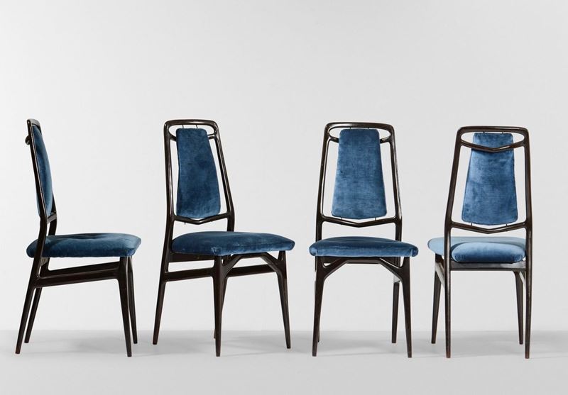 Otto sedie con struttura e sostegni in legno laccato e rivestimenti in tessuto.