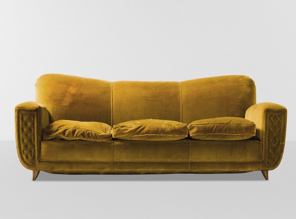 Divano con struttura e sostegni in legno e rivestimento in velluto.