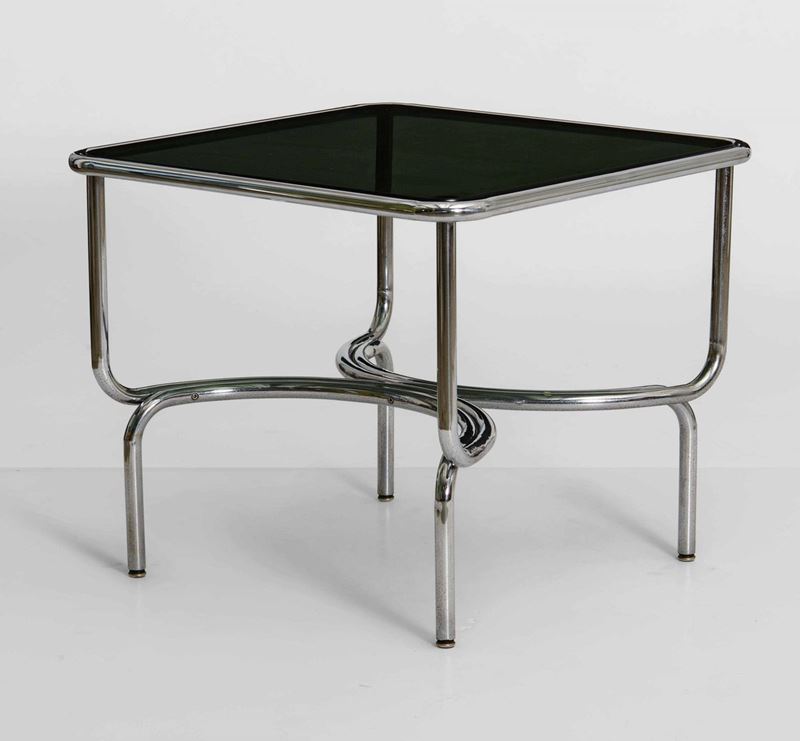 Set composto da tavolo e quattro sedie della serie Locus Solus con struttura in tubolare di metallo cromato. Piano in cristallo molato.