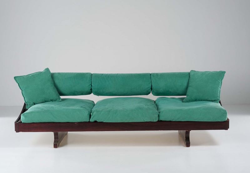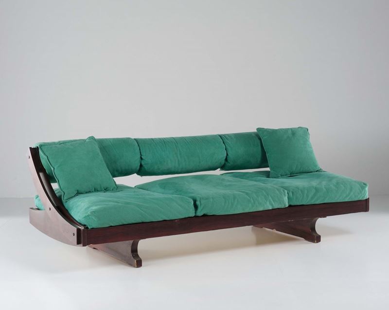 Divano mod. 6S 195 reclinabile con struttura in legno impiallacciato e rivestimenti in tessuto.