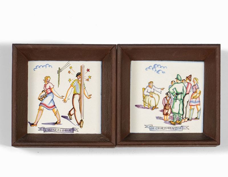 Cinque piastrelle con cornice in legno laccato e ceramica decorata.