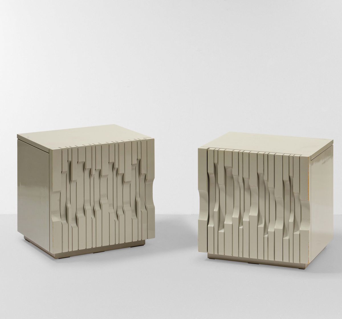 Coppia di mobili contenitori mod. Norman con struttura in legno laccato.