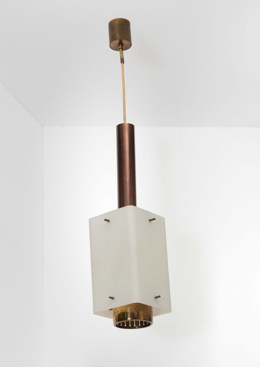 Due lampade a sospensione con struttura in ottone e metallo. Diffusore in vetro opalino.