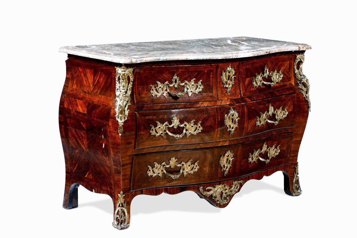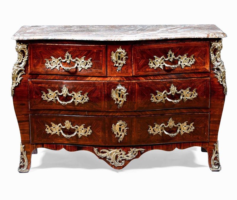 Commode Luigi XV lastronato in violetto con applicazioni di bronzi dorati, stampigliato Coulon, Francia XVIII secolo