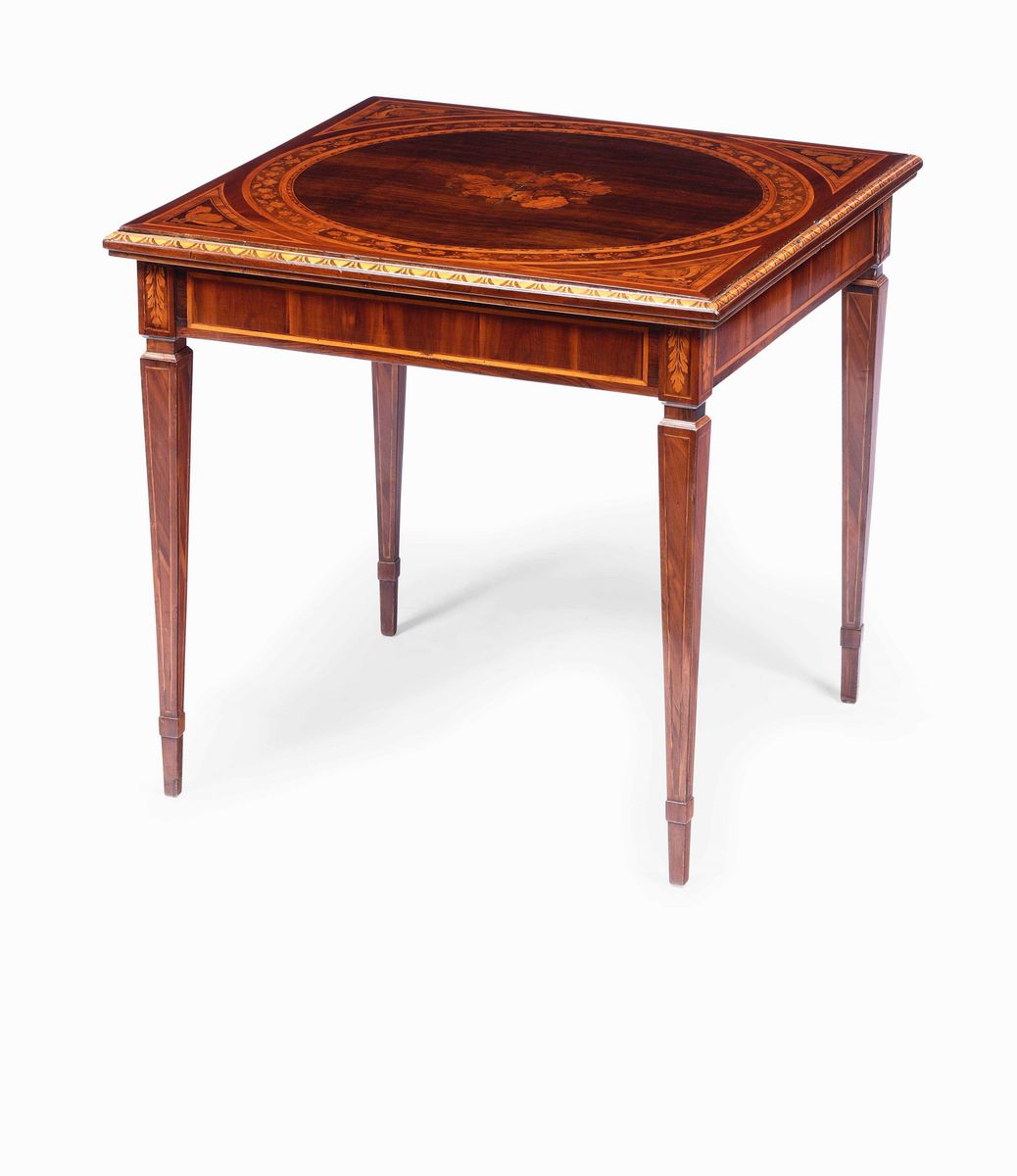 Tavolo da gioco di gusto neoclassico Luigi XVI lastronato in palissandro e bois de rose, Lombardia, Giuseppe Maggiolini, [..]