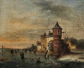Andreas Schelfhout (L'Aia 1787-1870) Paesaggio invernale con pattinatori