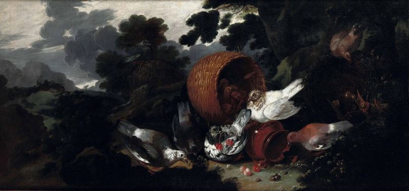Giovanni Agostino Cassana Venezia 1658 - Genova 1720) Paesaggi con galli, galline e colombe