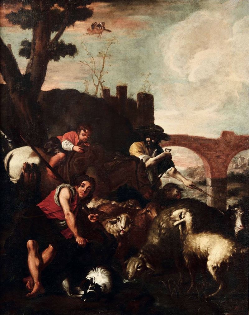 Philipp Peter Roos detto Rosa da Tivoli (Francoforte sul Meno 1655 - Tivoli 1706), ambito di Paesaggio con pastori, armenti [..]