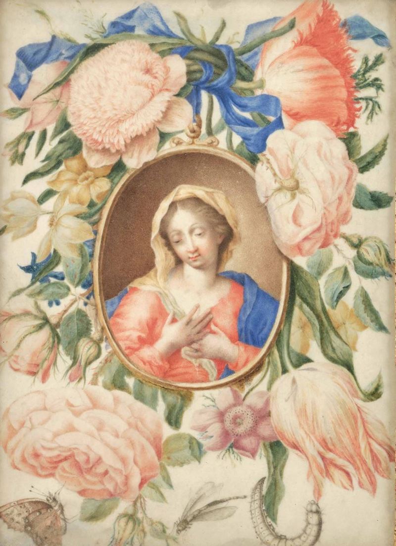 Scuola dell'Italia centrale del XVII secolo Vergine entro ghirlanda di fiori