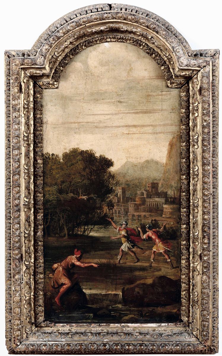 Scuola ferrarese del XVII secolo Paesaggio con cavalieri e viandante presso un ruscello