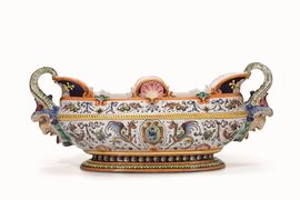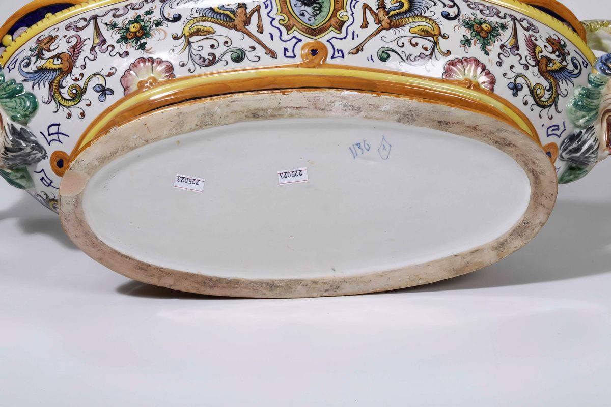 Dalla sezione ovale presenta ai lati due mascheroni che fungono da manici. La decorazione policroma è a raffaellesche policrome su fondo bianco ispirate alla tradizione rinascimentale italiana