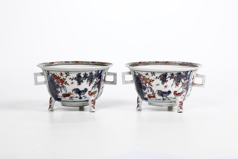 Dalla forma rotonda, queste zuppierine hanno due manici a sezione rettangolare e poggiano su tre piedini. Il modello è ripreso dai contenitori brucia incenso giapponesi. Anche la decorazione policroma, con rami di fiori indiani, galli e insetti in volo, si rifà a quella delle porcellane giapponesi Arita in stile Kakiemon. Sul recto due donne orientali, dipinte in blu e oro, passeggiano in un giardino con staccionata
