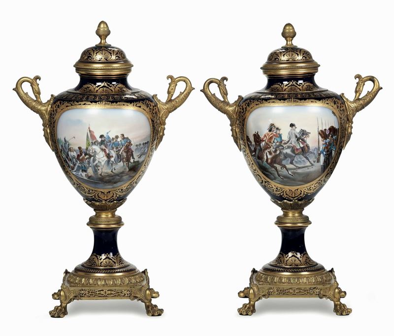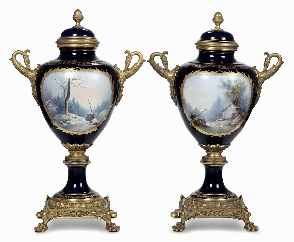 Porcellana policroma e dorata; bronzi dorati. Marca: apocrifa di Sèvres con “M. Imp le de Sèvres” in rosso, sia sotto i vasi che sotto i coperchi; firma del pittore nella decorazione. Altezza totale cm 63. Conservazione: ottima