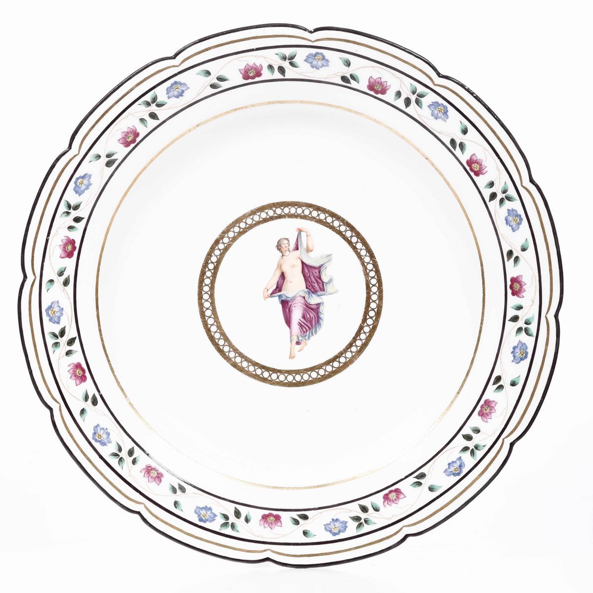 Il centro del piatto ospita un medaglione con una figura pompeiana incorniciata in oro, sulla tesa un nastro con profilature racchiude uno stelo sinuoso con foglie e fiori senza soluzione di continuità. La forma del piatto è del medesimo stampo di quello utilizzato per il celeberrimo “Servizio dell’Oca” eseguito tra il 1793 e il 1795 per la corte borbonica