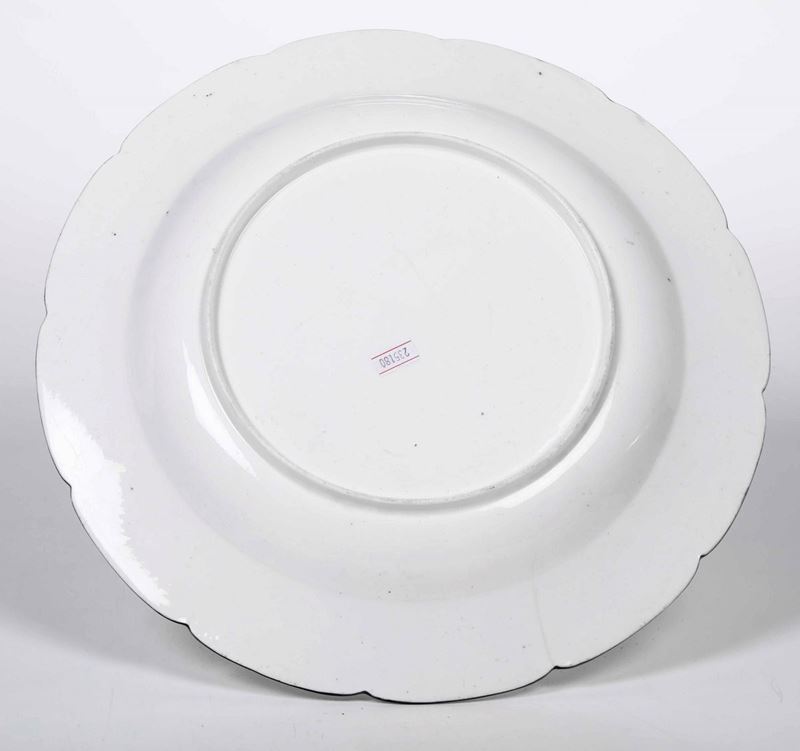 Porcellana tenera policroma. Marca: assente. Diametro cm 36 Conservazione: due insignificanti felaturine sulla tesa e una al centro