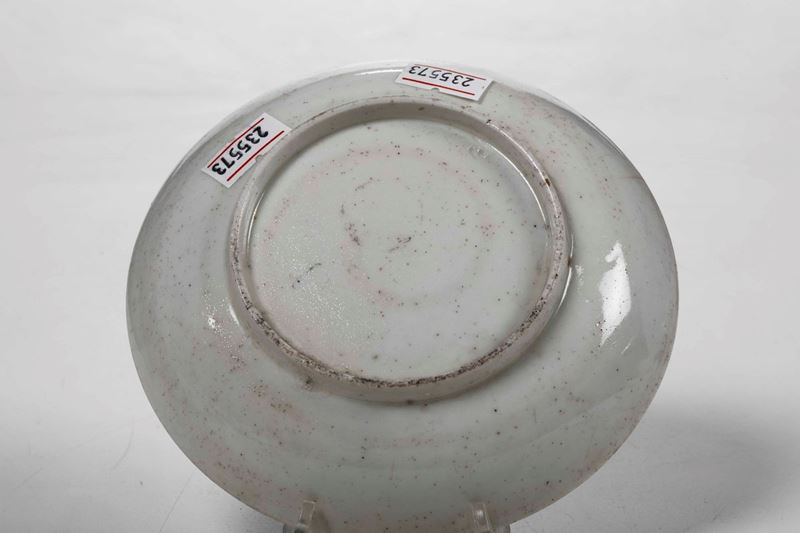 Porcellana. Marca: assente; “S” incisa. Diametro cm 13. Conservazione: sbeccatura e insignificante felatura al bordo