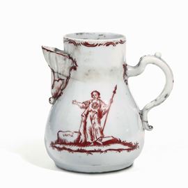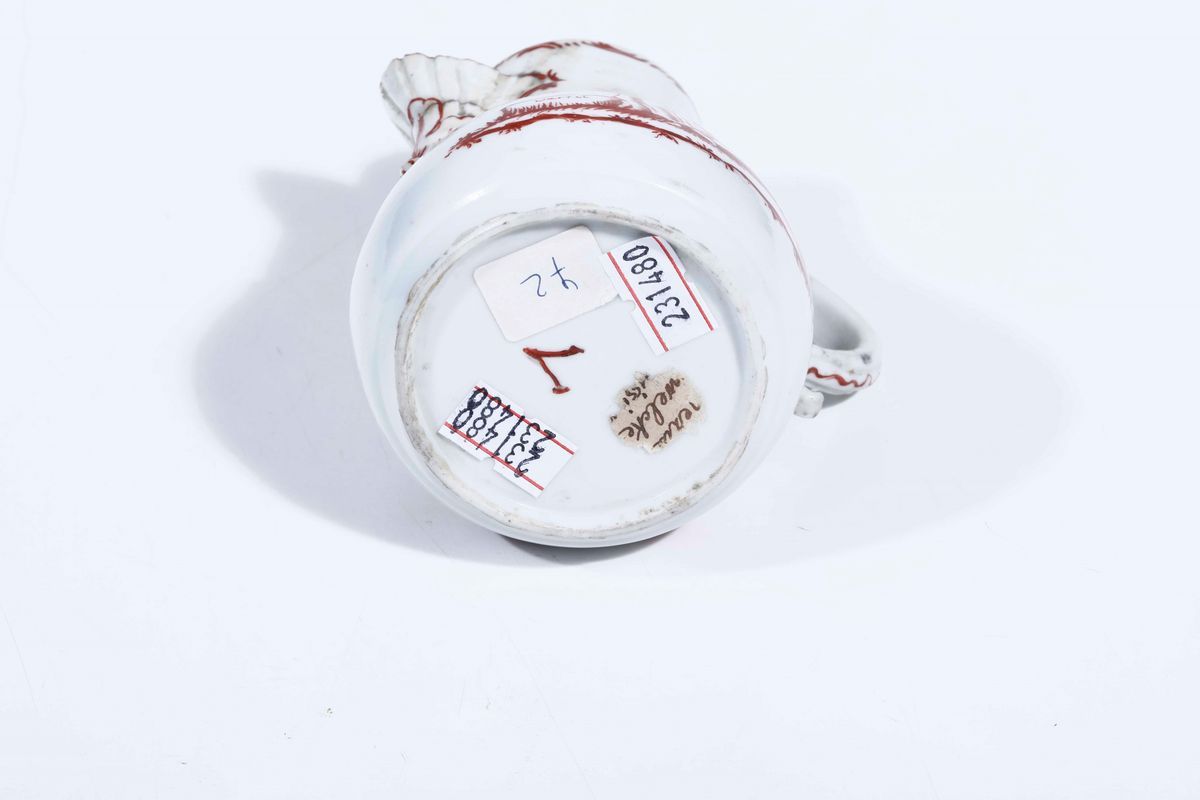 Porcellana. Marca: “V” incisa dipinta in rosso. Altezza cm 10. Conservazione: due piccole felature di cottura, una al manico e una al beccuccio