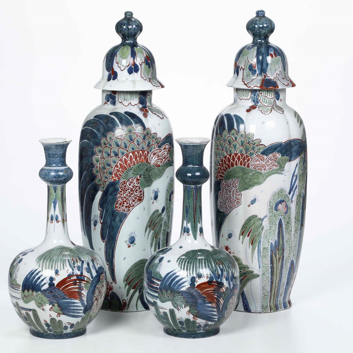 Questi rari ed interessanti vasi sono stati eseguiti da una delle fabbriche più longeve di Delft. Fondata nel 1653 è ancora oggi attiva ed è l’unica sopravvissuta alle oltre trenta manifatture di Delft del XVIII secolo. Le due potiches e i due vasi a forma di bottiglia sono decorati con grandi pavoni in giardini d’ispirazione orientale ricchi di vegetazione