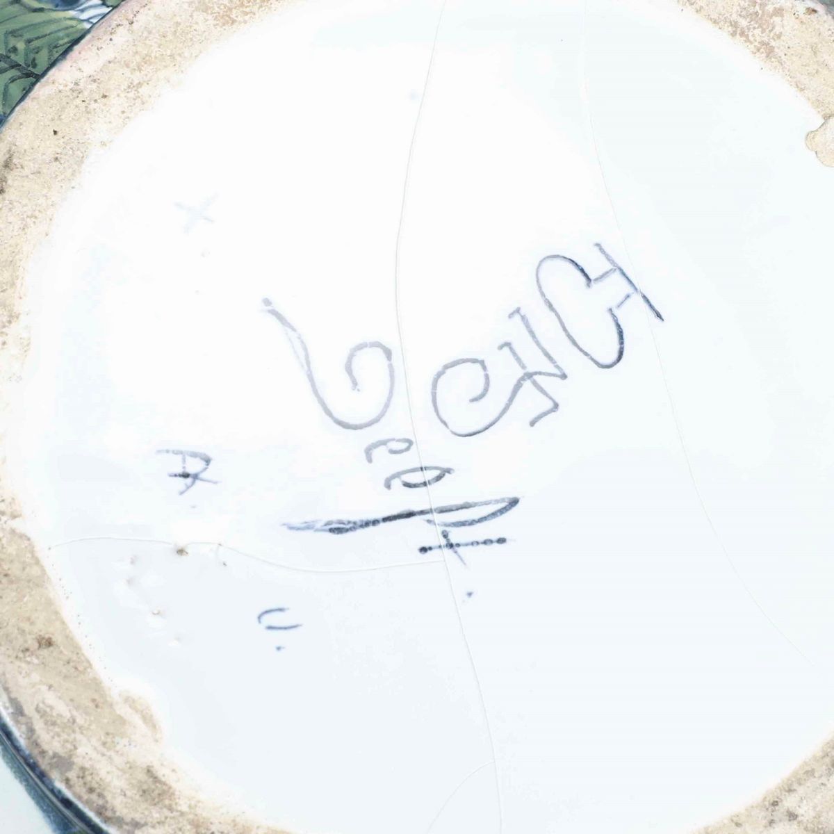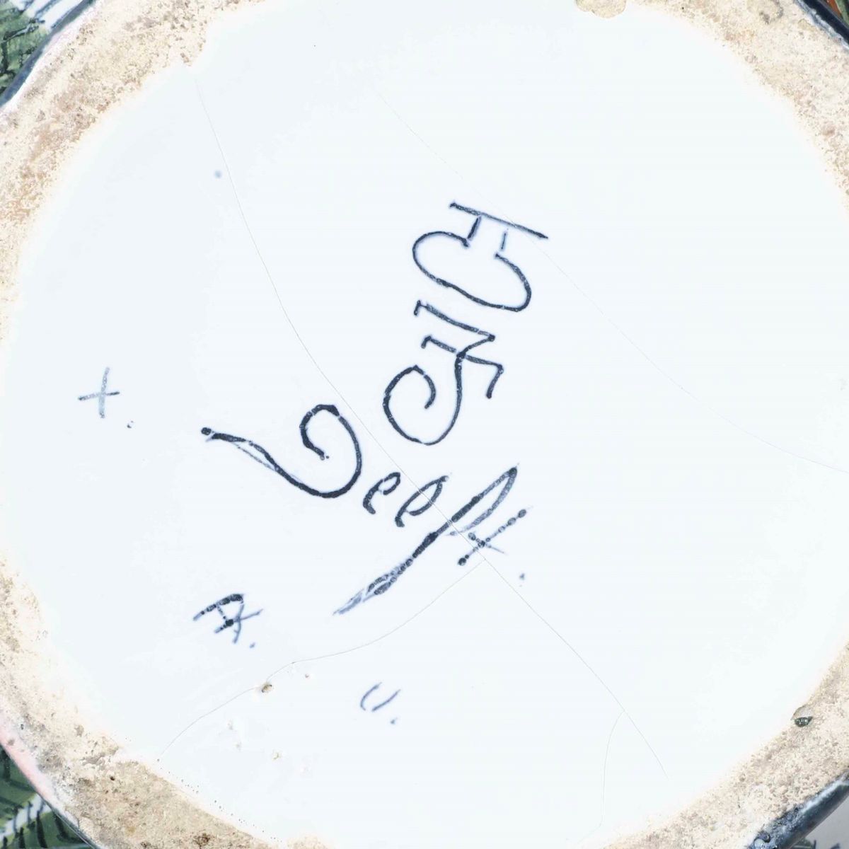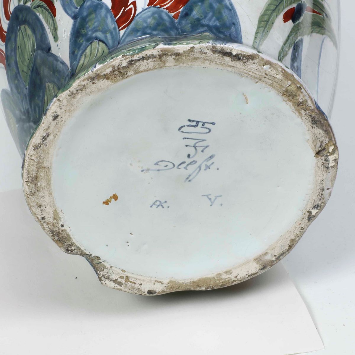 Maiolica policroma. Marca: vaso stilizzato con lettera “F”, “Delft”, “AK” e “V” in blu. Dimensioni: altezza totale potiches cm 52; altezza bottiglie cm 32. Conservazione: potiches in ottimo stato, una sbeccatura al bordo inferiore di un vaso; una bottiglia con sbeccatura al bordo superiore