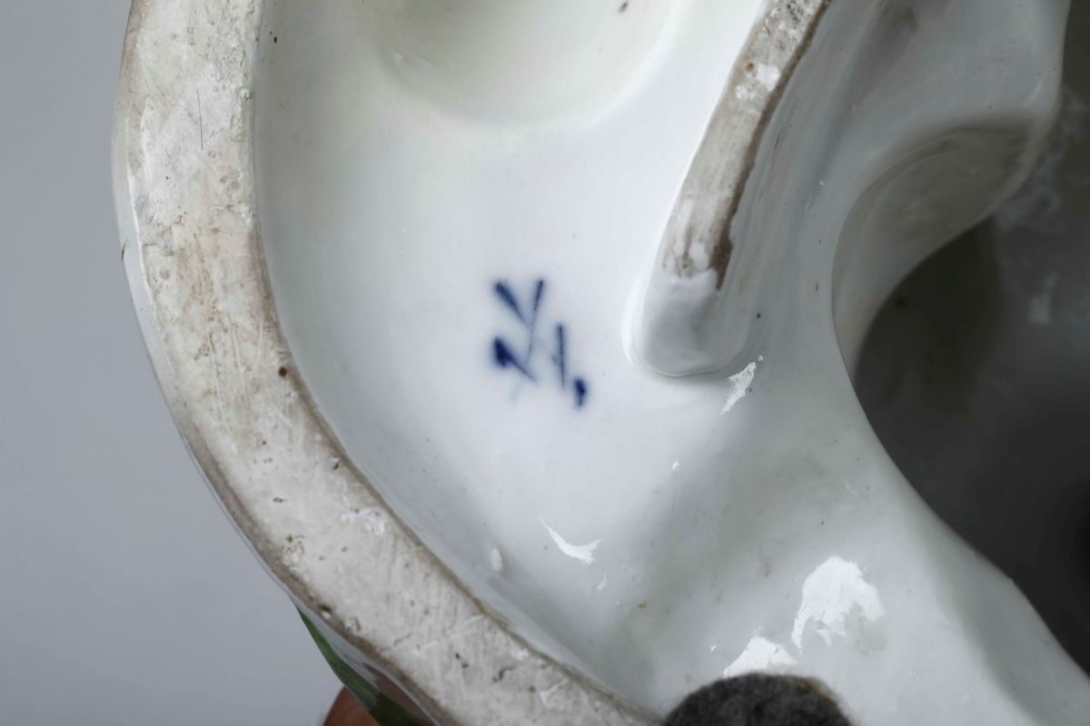 Porcellana policroma. Marca: spade in blu sotto la base. Altezza cm 26. Conservazione: ottima; felatura restaurata alla base che interessa anche le mappe e il piede destro di Urania; restauri e mancanze minori alla vegetazione