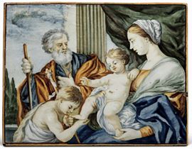 In questa targa Gesù benedice San Giovannino che gli sta baciando un piede in atto di devozione, mentre la Vergine e San Giuseppe appaiono sorpresi dal gesto. Questa scena è ripresa probabilmente dalla grande pittura barocca romana. Troviamo questa scena su altre targhe castellane, vedi ad esempio la targa del Kunstgewerbemuseum di Berlino (T. Hausmann, Majolika. spanische und italienische Keramik vom 14. bis zum 18. Jahrhundert, Berlin 1972, p.360-362); quella della collezione Acerbo (L.Arbace, Maioliche di Castelli, La raccolta Acerbo, Ferrara 1993, n. 59); quella esposta a Napoli nel 1955 (G.C.Polidori, a cura di, Mostra dell’antica maiolica abruzzese, Napoli-Teramo 1955, n.100, Tav.XLIX)