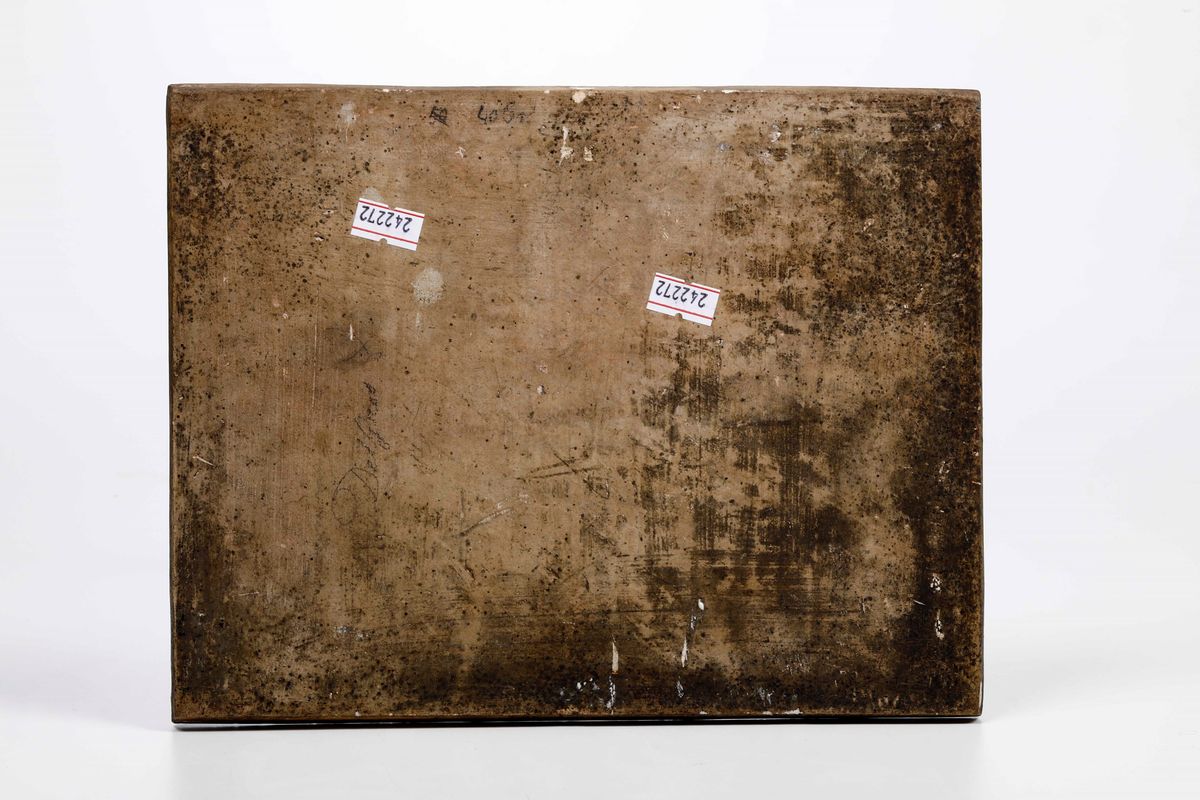 Maiolica decorata con colori a gran fuoco. Dimensioni: cm 19,5x25,5. Conservazione: ottima, una piccola sbeccatura sul bordo del lato destro e una minima sull’angolo inferiore a sinistra