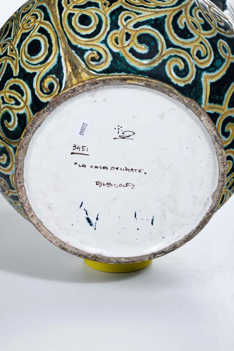 Maiolica policroma. Marca: simbolo grafico della manifattura con la lampada di Aladino e “La Casa dell’Arte Albisola”, numero “3451” in manganese. Altezza cm 47. Conservazione: alcune sbeccature al bordo della base