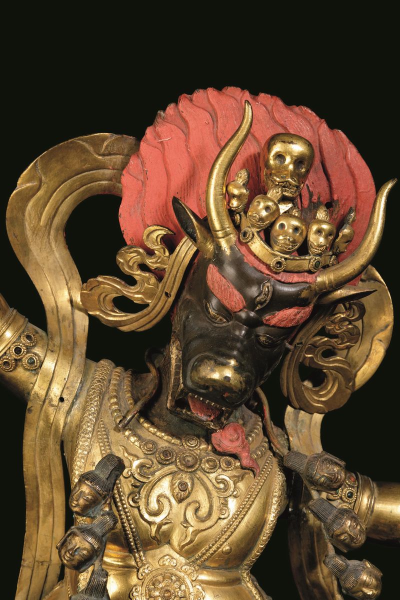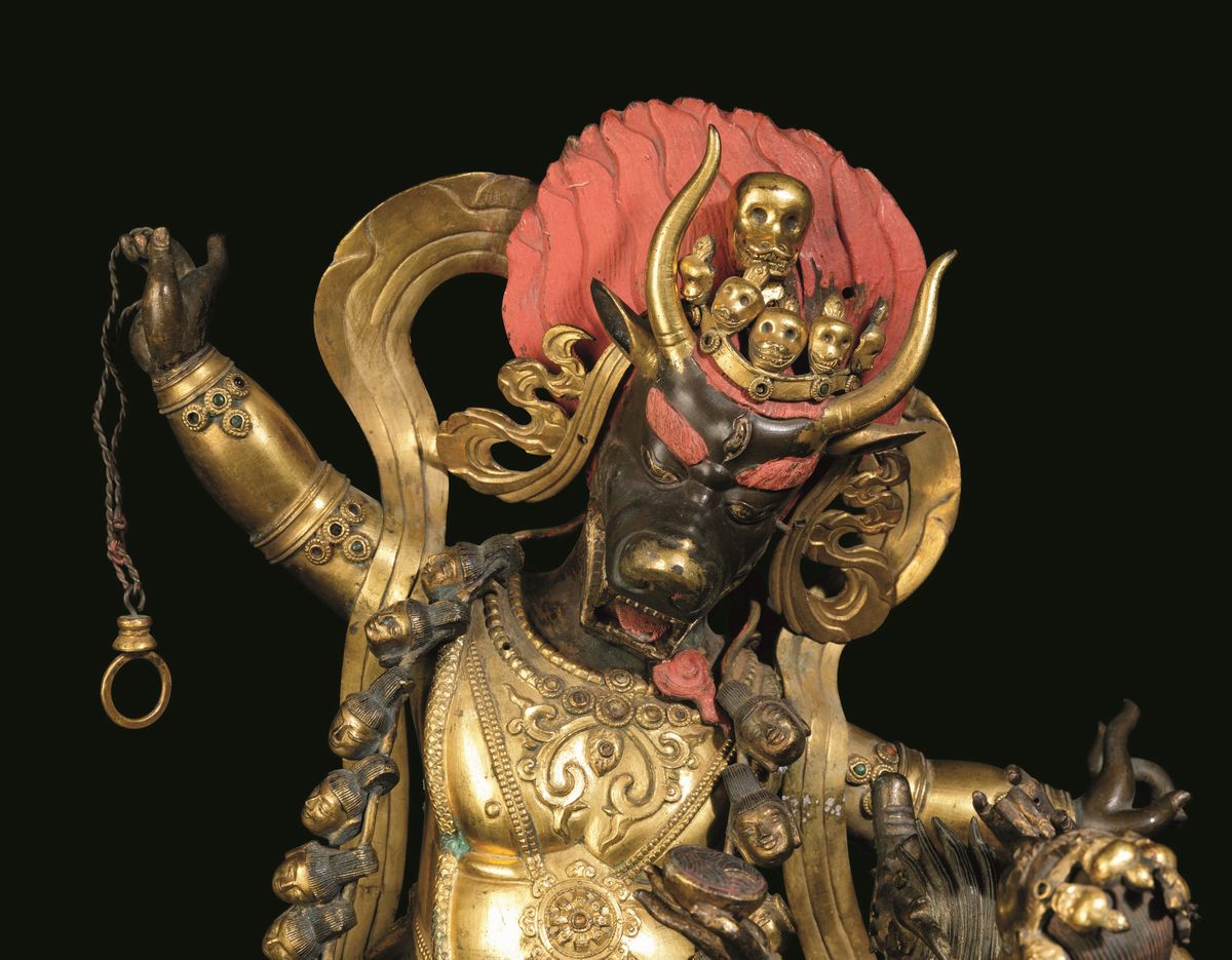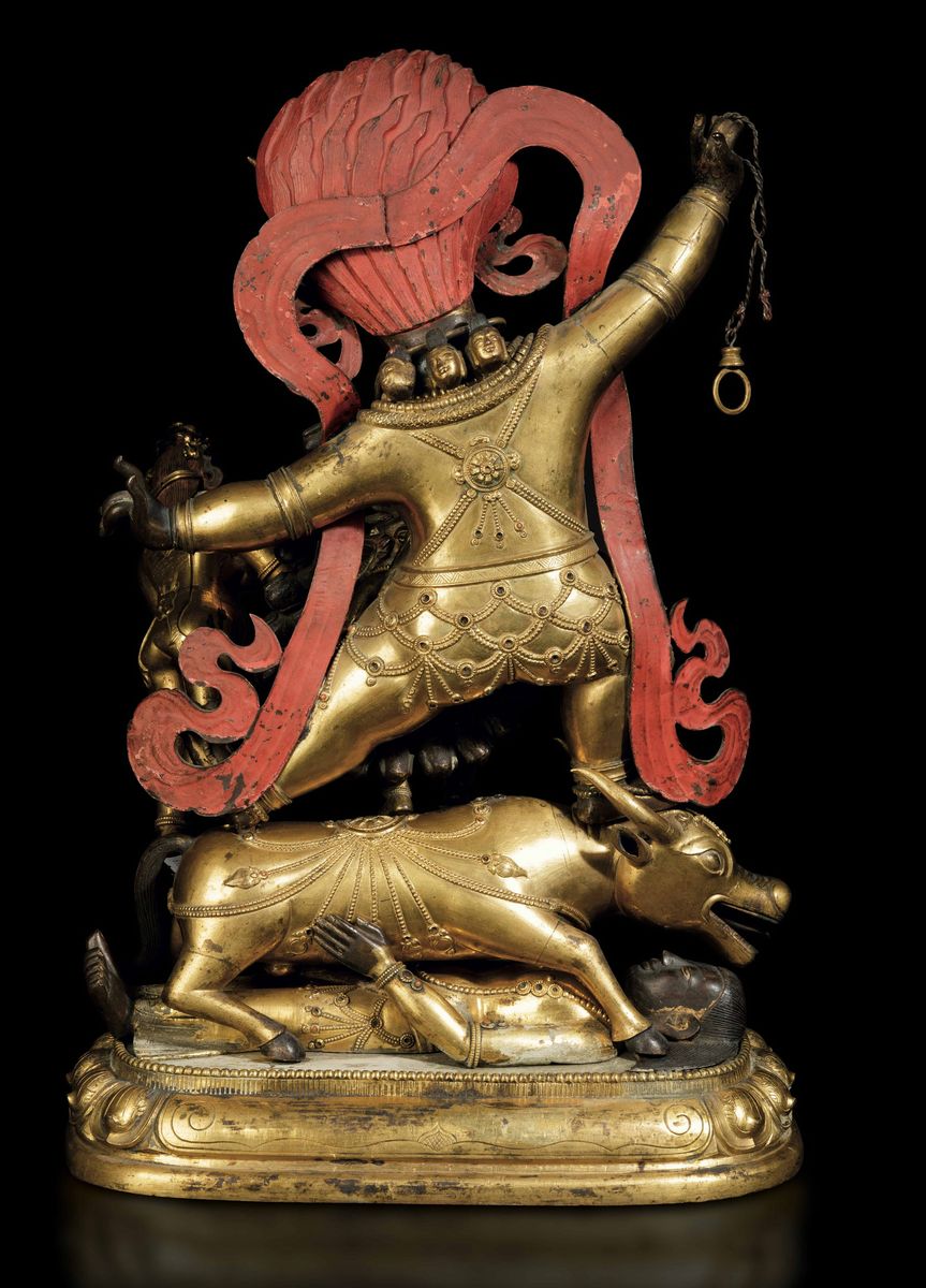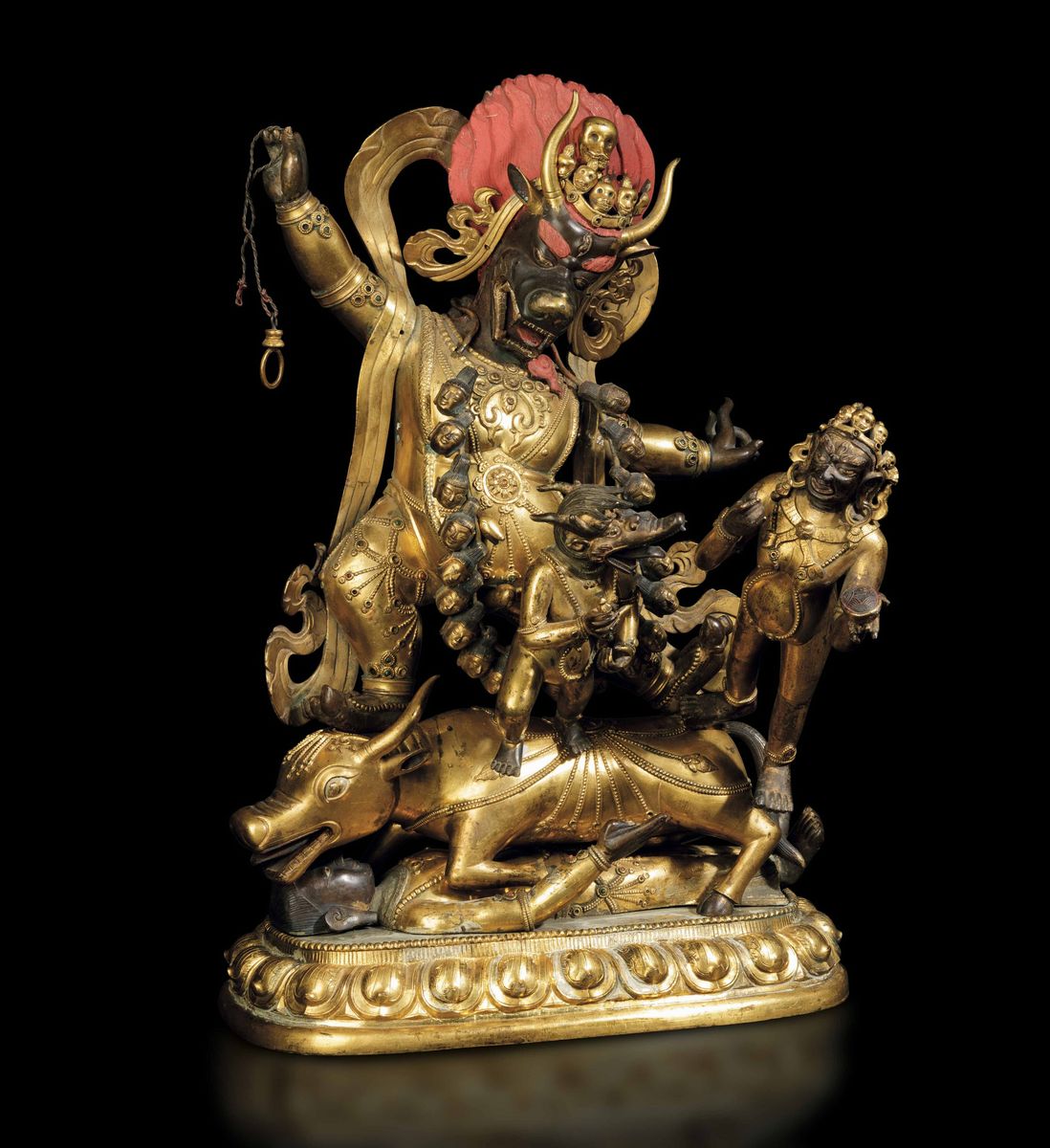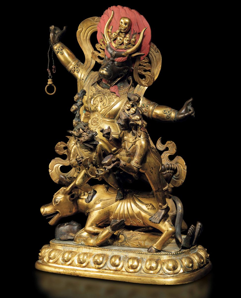 Qianlong period (1736-1796). Partially gilt bronze with traces of polychromy, depicting Yama Lord of Hell with Yami and Shri Devi standing on a lotus flower. H 52.5cm
