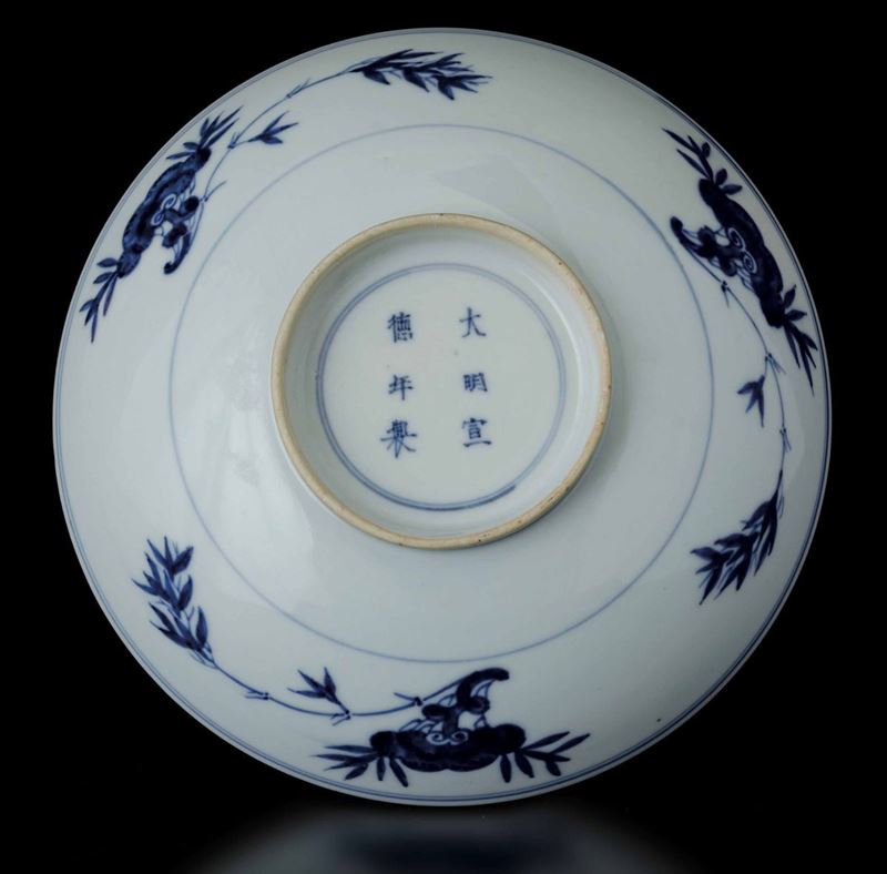 Kangxi period (1662-1722). White and blue porcelain. Apocryphal Xuande mark. Diam 20cm