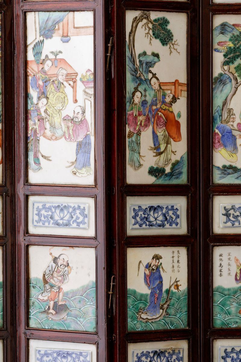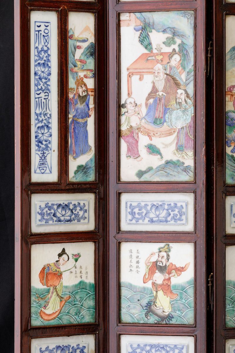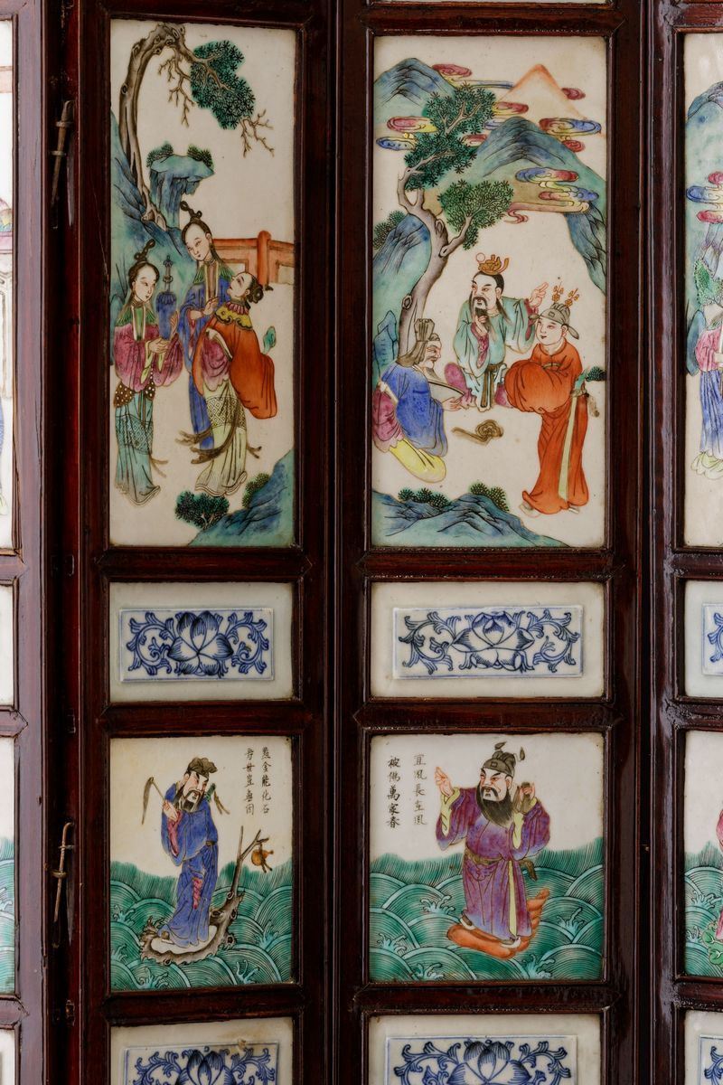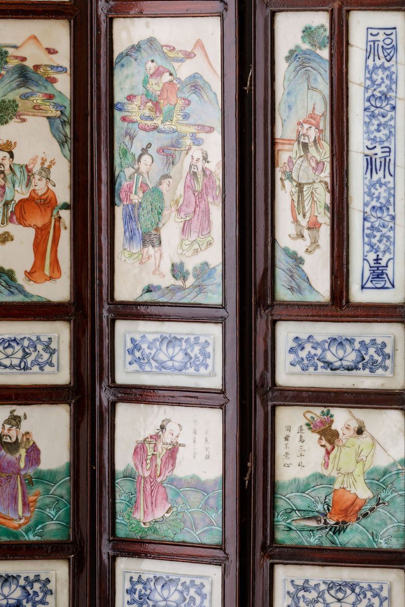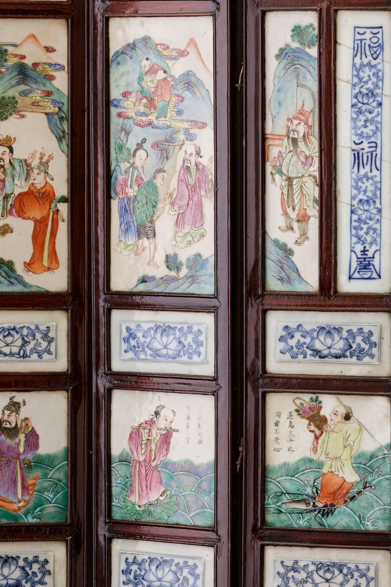1800s. Porcelain plaques depicting everyday life scenes, floral decors and inscriptions. Each fold: 83.5x16cm