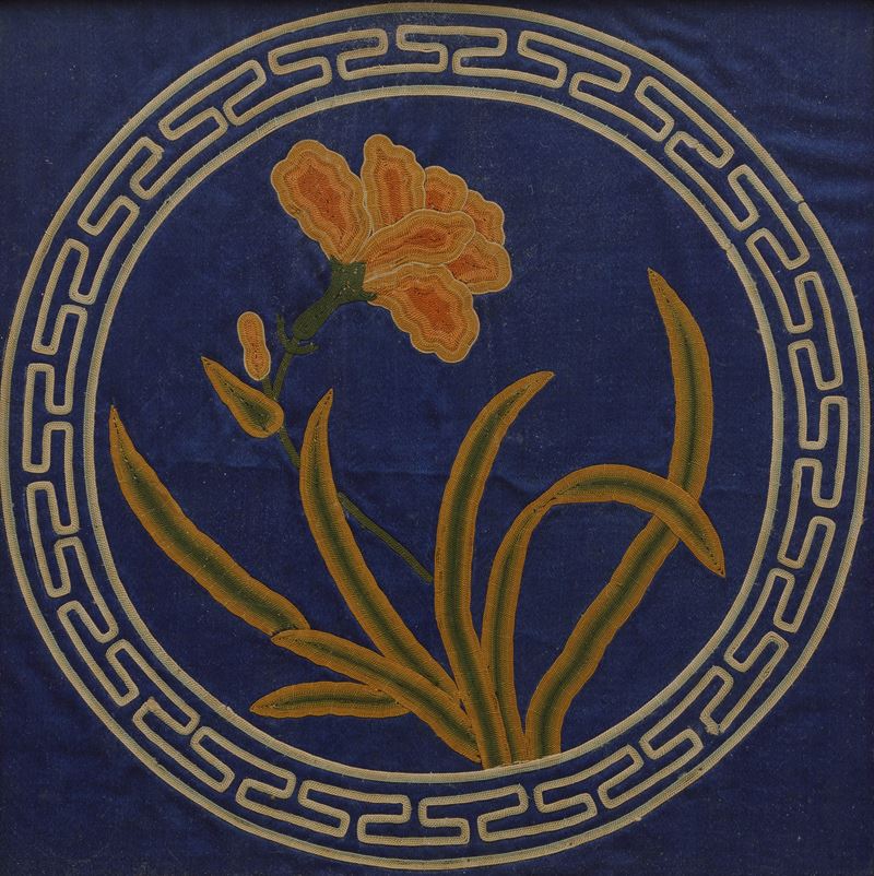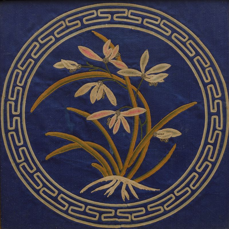 Three embroidered silk canvases, China, Qing Dynasty