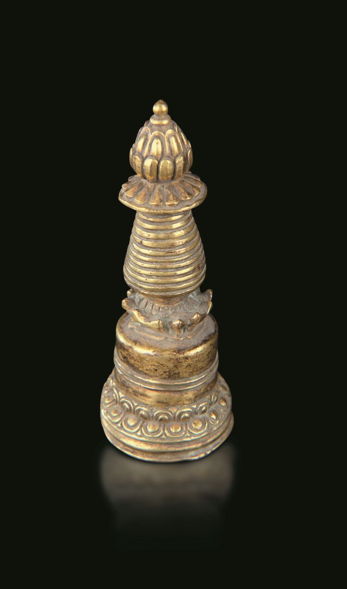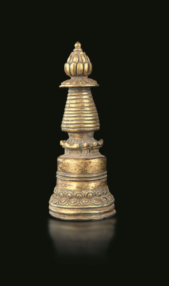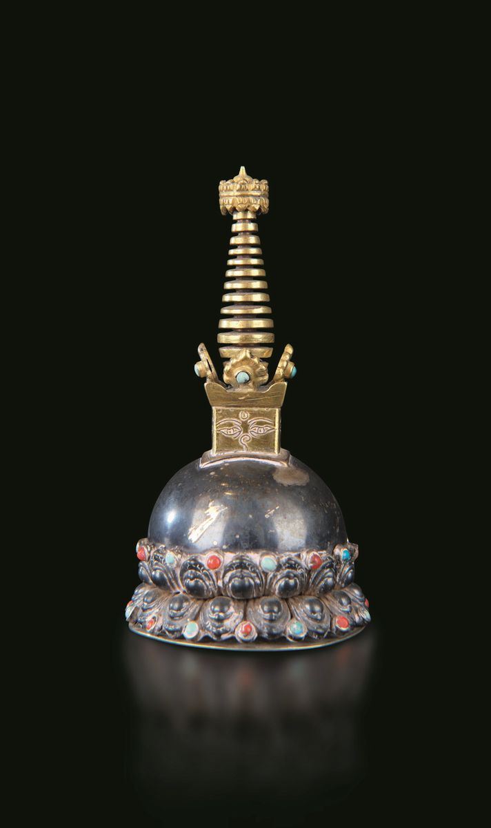 A stupa and two ritual bells in bronze, silver and semiprecious stone inlays. H from 11cm to 12cm