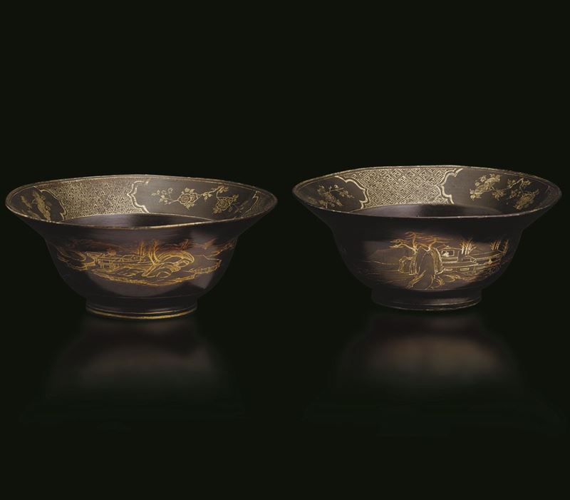 Qianlong period (1736-1796). Brown lacquer with gold decors. H 7.5cm, diam 18cm