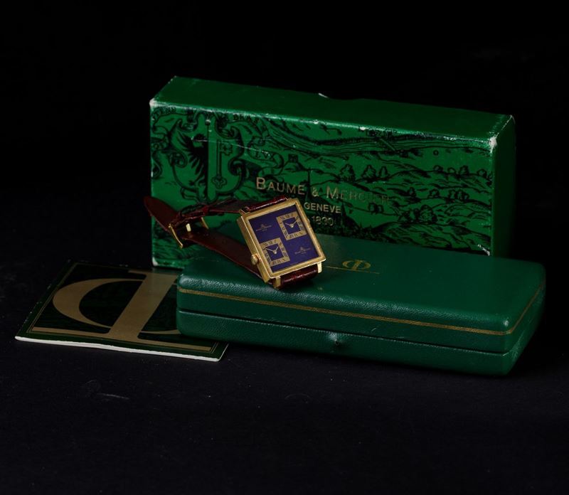 BAUME & MERCIER - Elegante Dual Time Zone quadrato d'oro 18k, con due movimenti indipendenti, quadrante color lapis e corredo completo