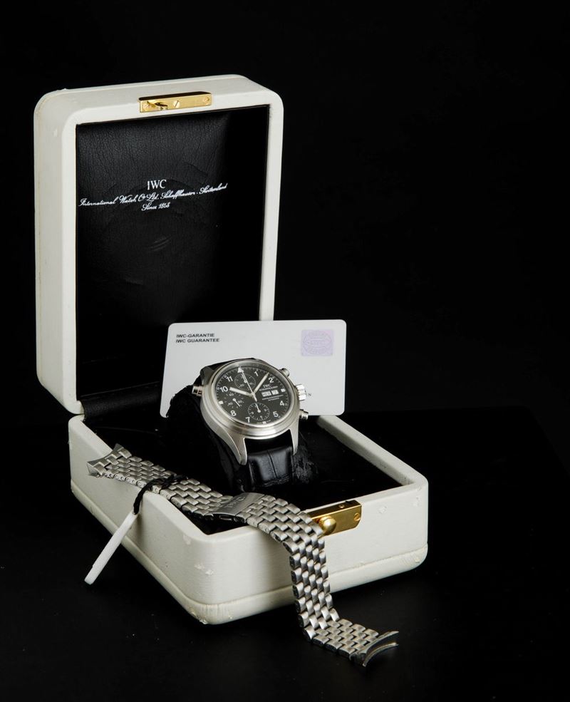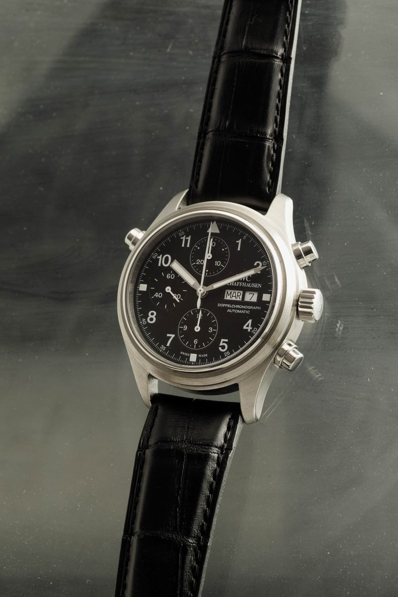 IWC - Doppelchronograph ref 3711, cronografo rattrappante con giorno e data in acciaio. Accompagnato da scatola e garanzia, circa 2000