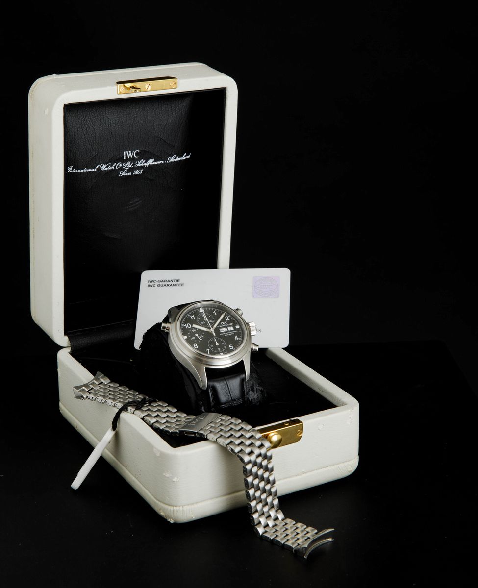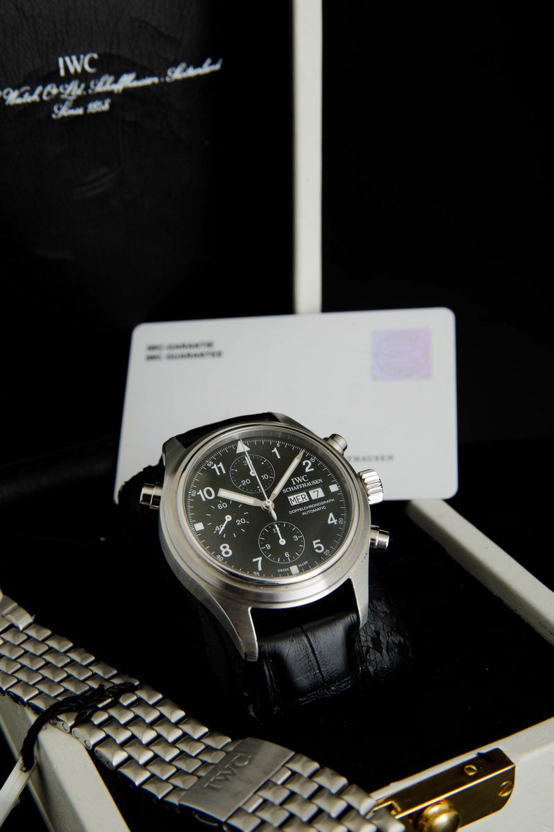 IWC - Doppelchronograph ref 3711, cronografo rattrappante con giorno e data in acciaio. Accompagnato da scatola e garanzia, [..]