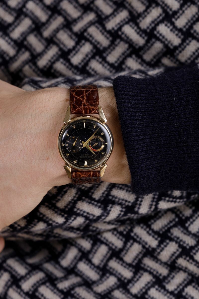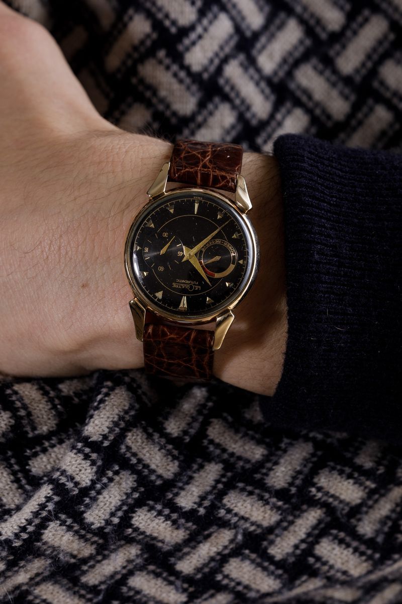 Questo particolarissimo orologio è stato per i suoi anni davvero Fututistico. La prima cosa che possiamo notare è la sua perfetta simmetria data dal posizionamento della corona sotto al fondello. Il movimento, inoltre è dotato di un efficiente sistema di carica a martello che ha permesso di eliminare i ruotismi della carica manuale facendo spazio ad un bilancere più grande del solito per incrementare la regolarità di marcia e la precisione.