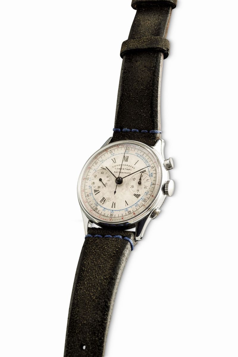 LOWENTHAL - Cronografo monorattrappante in acciaio, fondello a pressione, anni '40. Orologio professionale con scala tachimetrica [..]