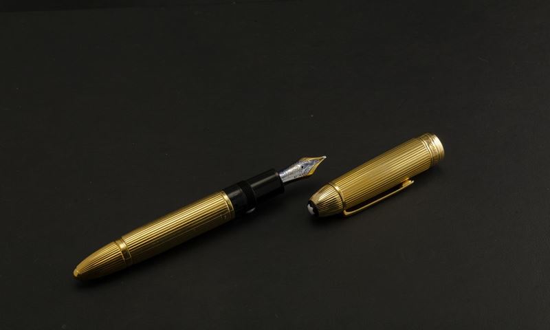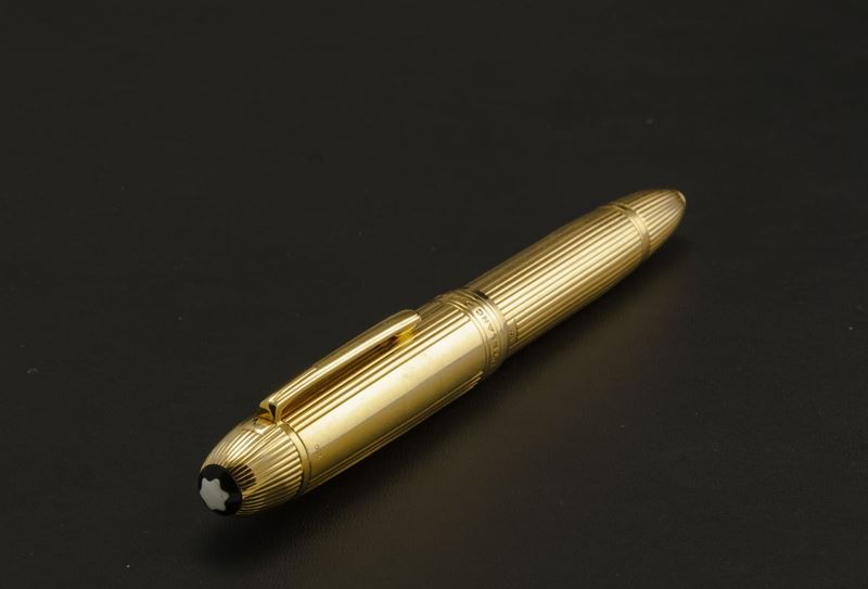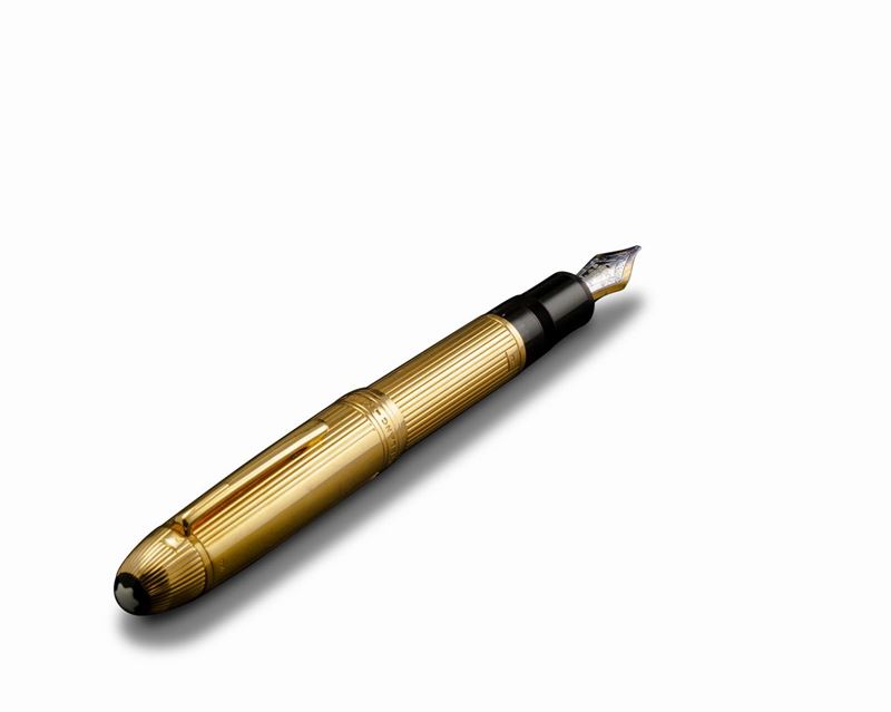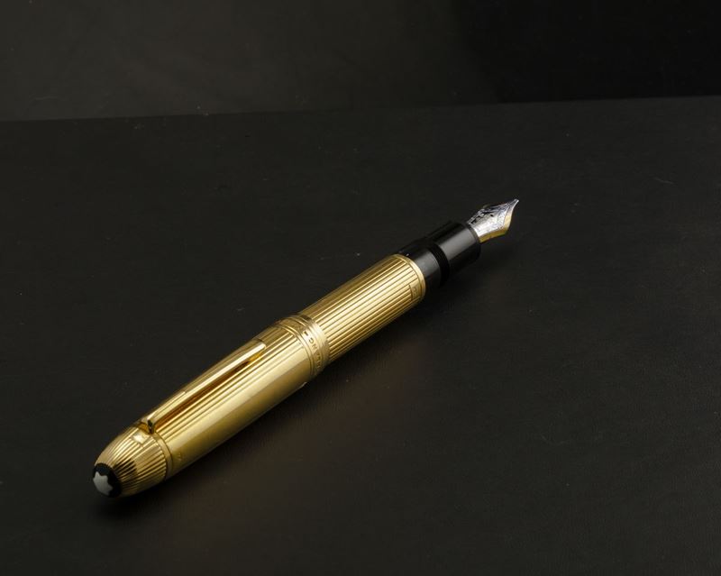 Montblanc Solitaire 149 in oro massiccio 18 k con lavorazione a righe verticali con pennino in oro 18 k accompagnato da astuccio e garanzia.