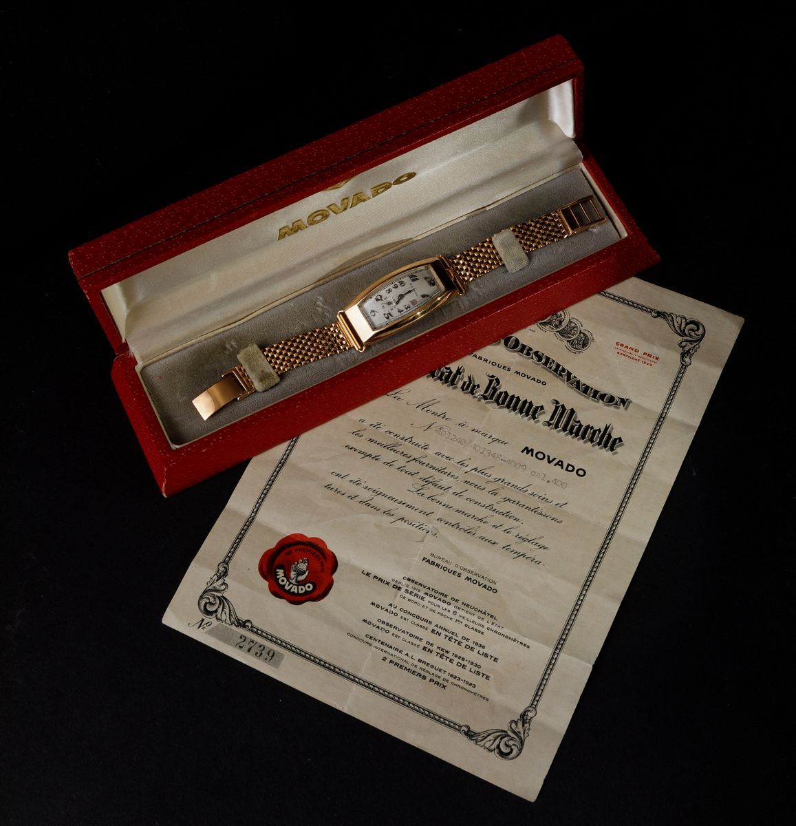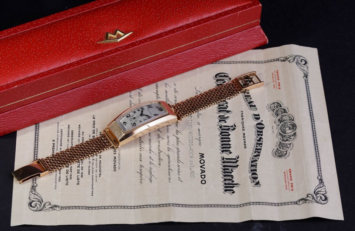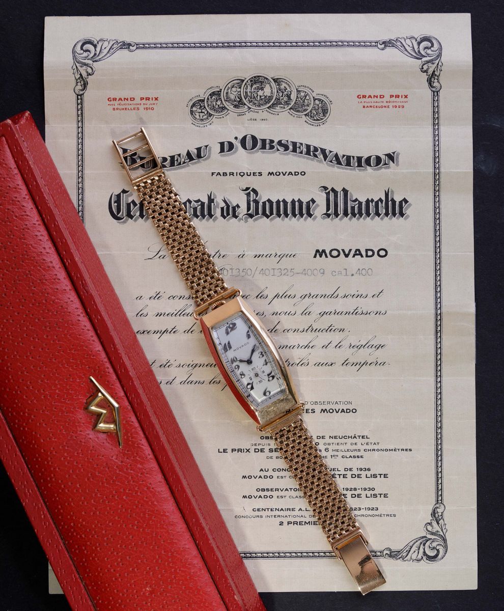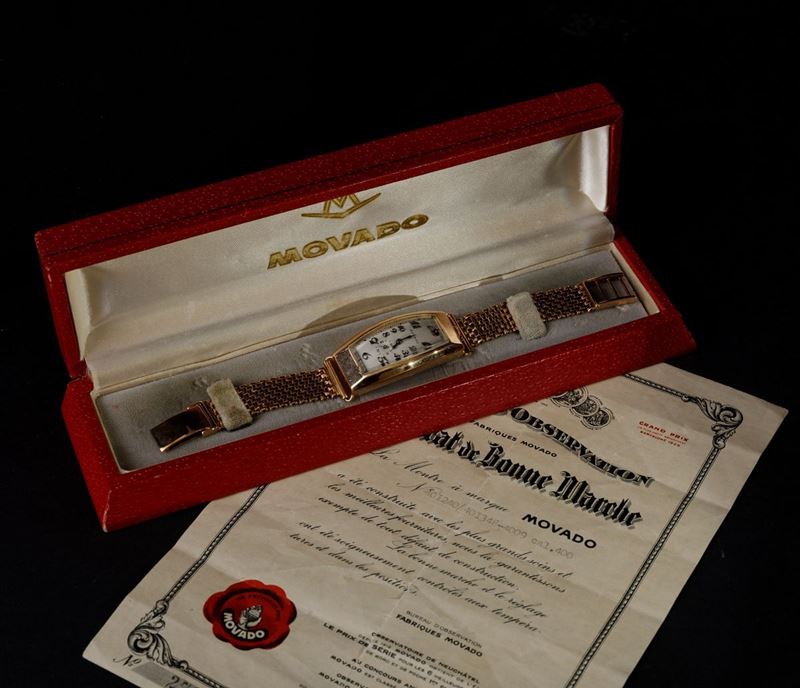 MOVADO - Polyplan con cassa curvex in oro rosa 18k, secondi in basso. Accompagnato da astuccio originale e certificato dell'epoca