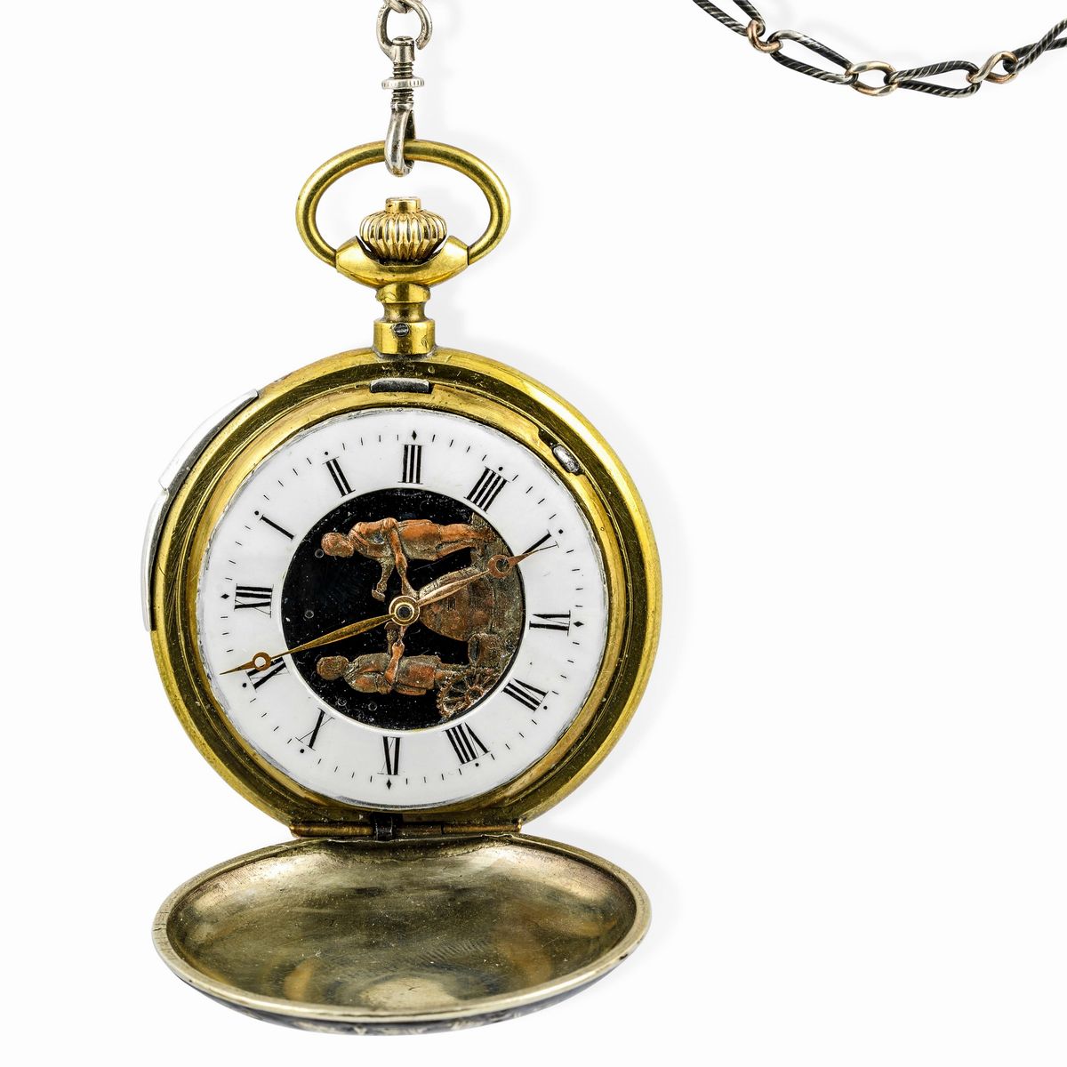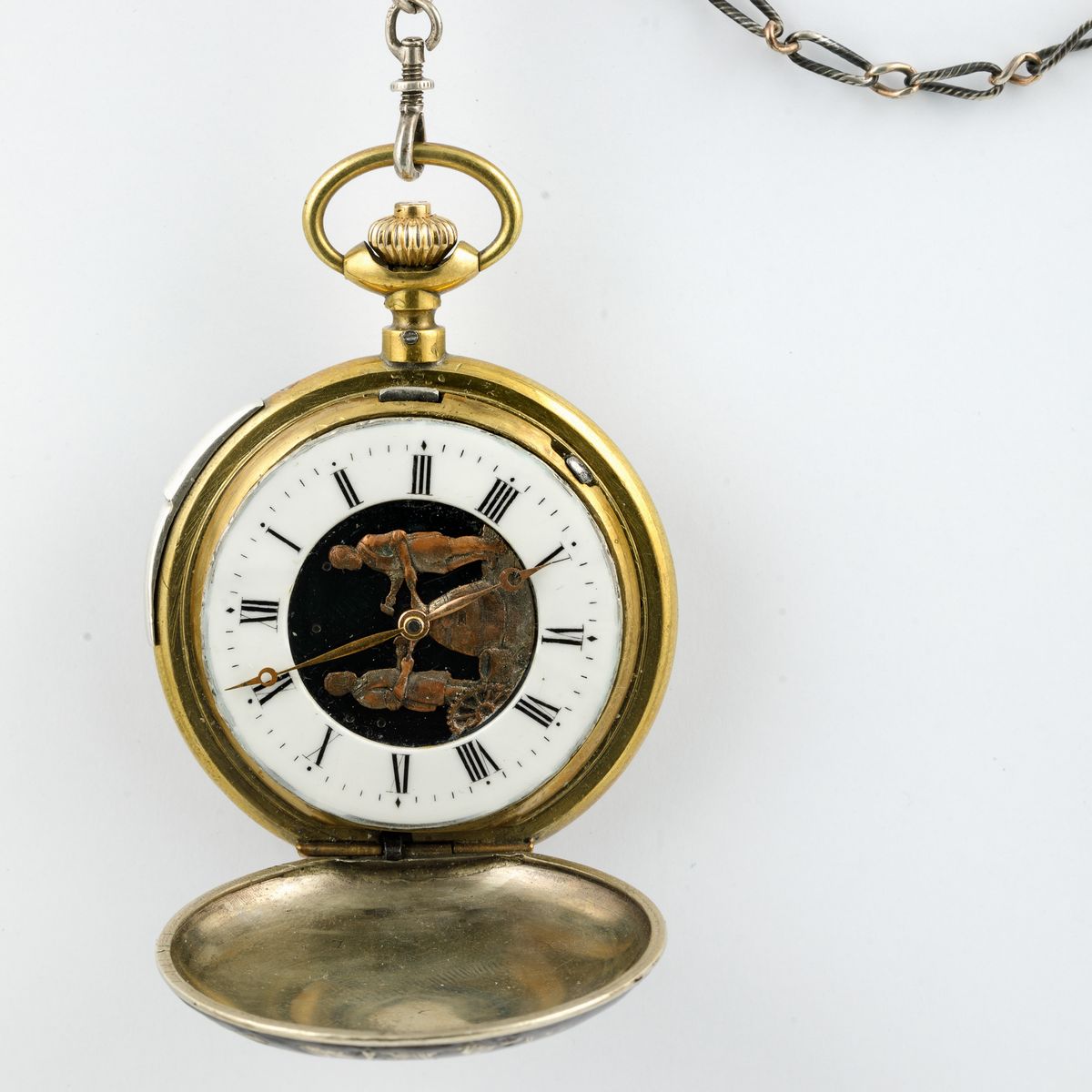 Orologio automa anonimo da tasca in argento niellato con scene di caccia ripetizione ore e minuti a slitta