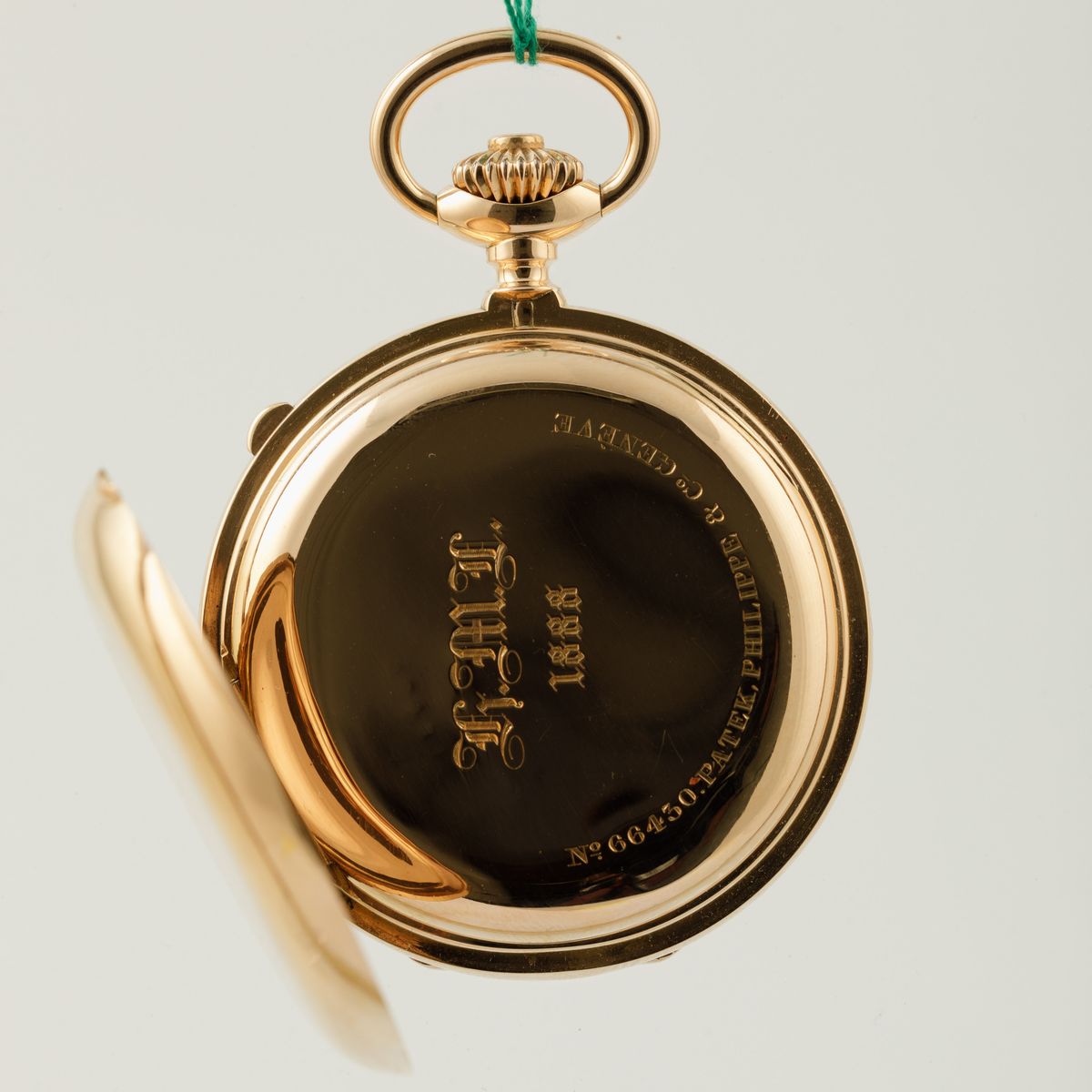 Orologio con complicazione cronografica in perfetto stato di conservazione con il suo straordinario corredo, nonostante 130 anni e più dalla sua produzione. Corredato da Estratto d’archivio, astuccio in marocchino, cristallo di ricambio e bustina numerata e timbrata contenente un gioco sfere di scorta. Questo magnifico segnatempo riveste anche un importanza storica, poiché è uno dei primi a recare impresso il punzone di Calatrava, simbolo e logo di Patek Philippe, introdotto nel 1887.