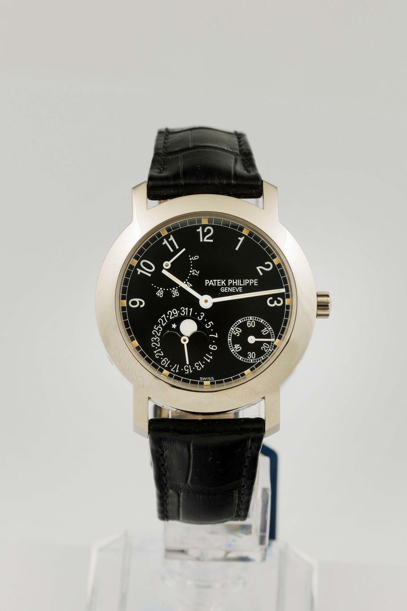 PATEK PHILIPPE - ref. 5055G-001, Raro orologio con riserva di carica, fasi lunari e calendario. Scatola e Garanzia