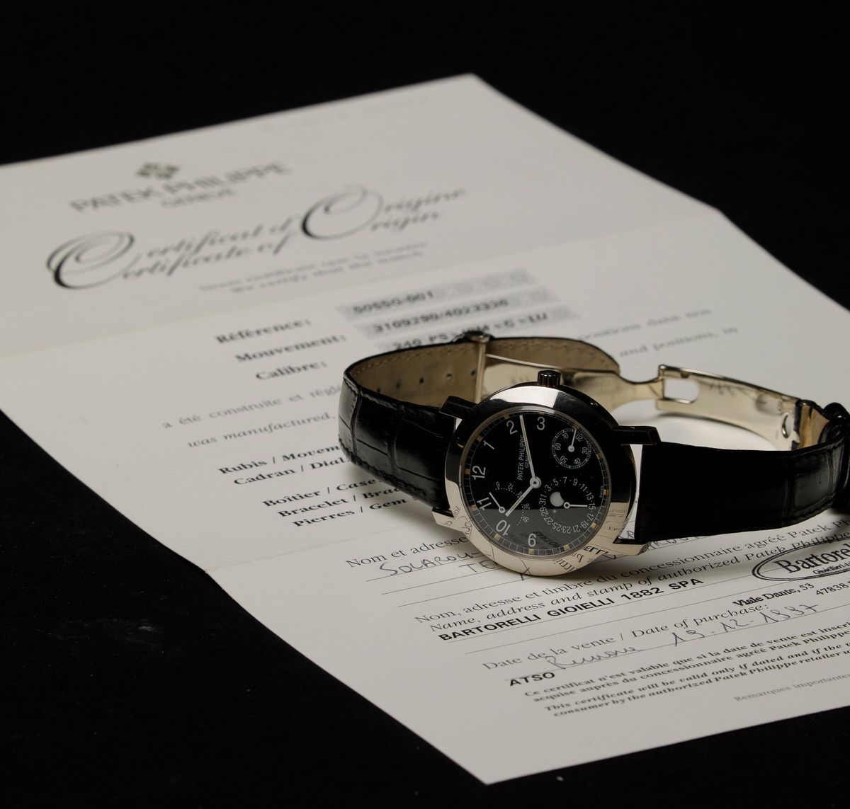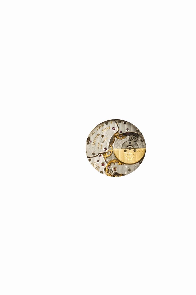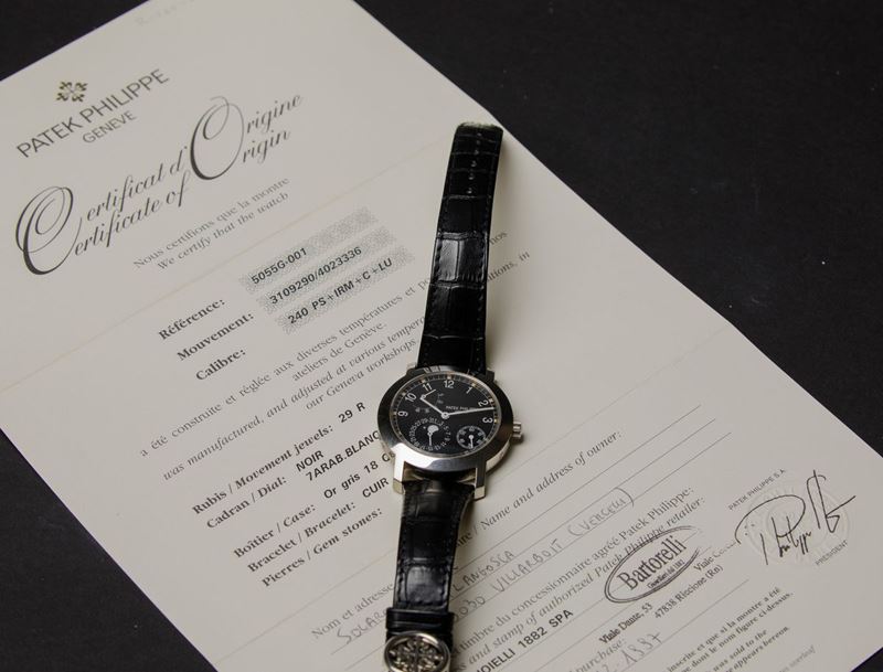 La referenza 5055 è stata prodotta dal 1998 al 2004 in oro giallo, oro bianco, oro rosa e in platino. La configurazione del presente esemplare in oro bianco con quadrante nero rende l’orologio elegante e sportivo al tempo stesso.