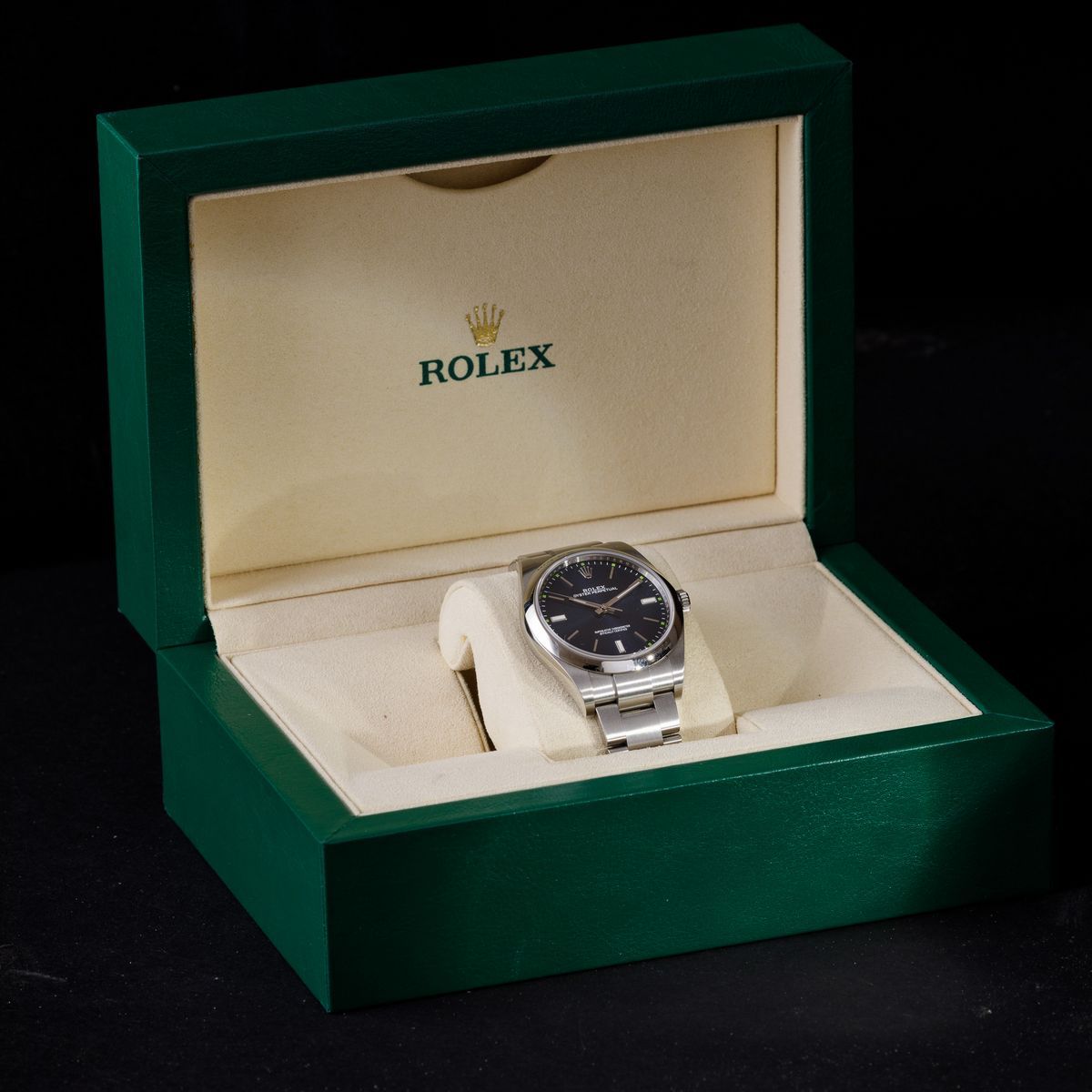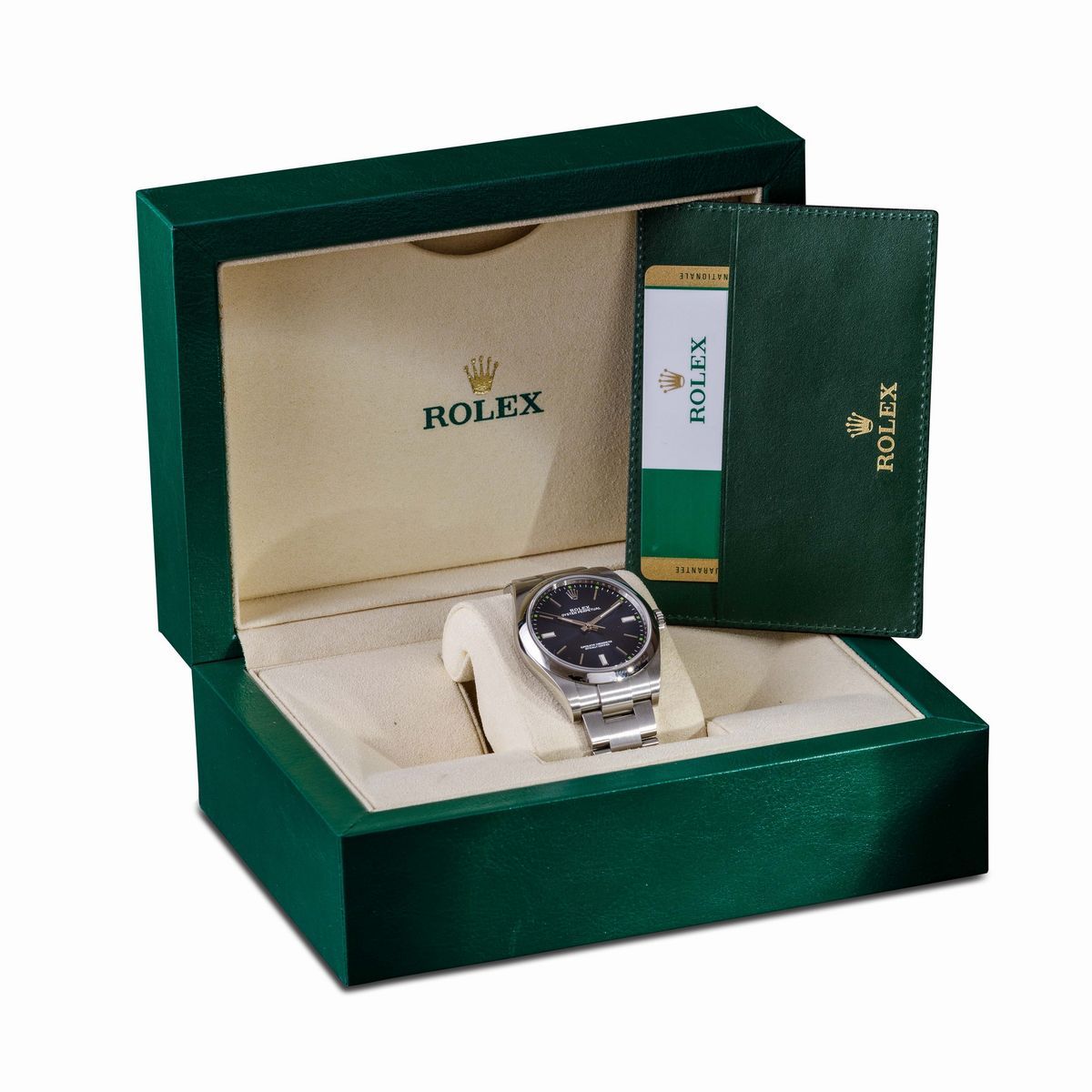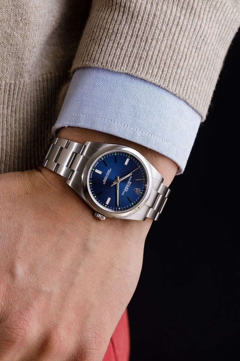 ROLEX - Oyster Perpetual ref 114300, Oyster acciaio, quadrante blu radiale con piccoli indici verdi, 2019. Scatola e garanzia